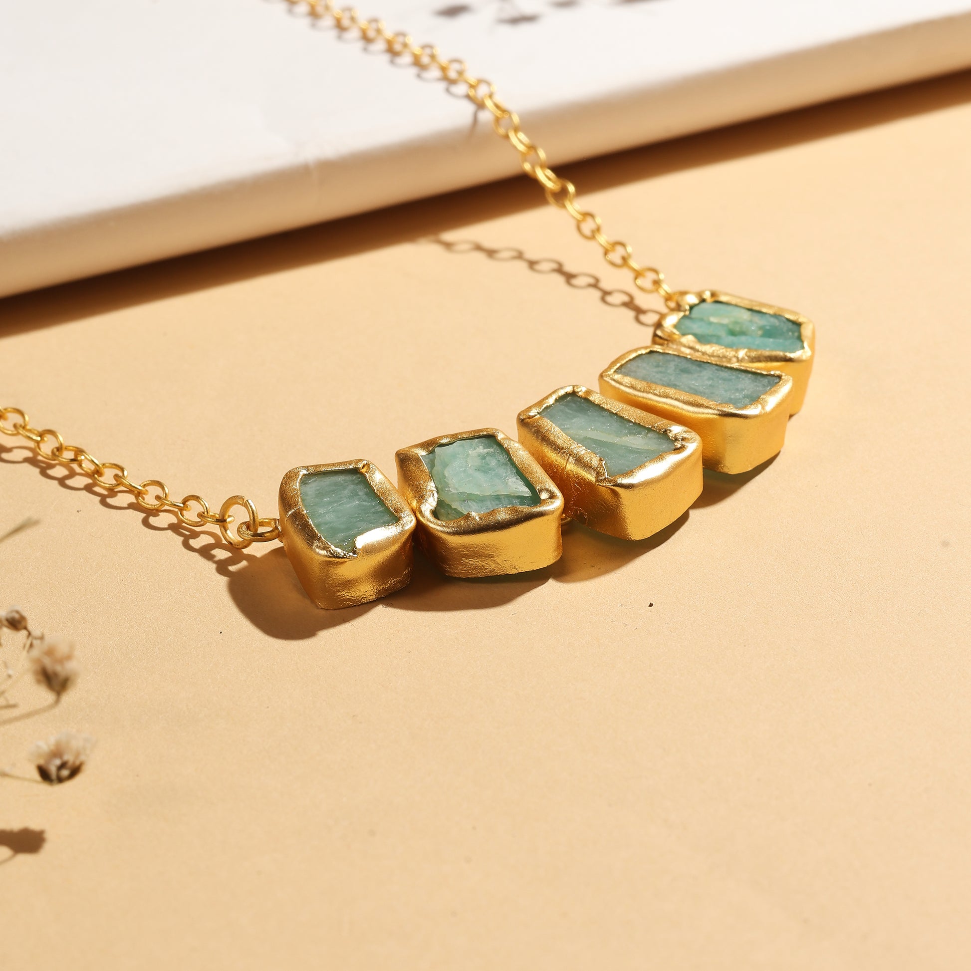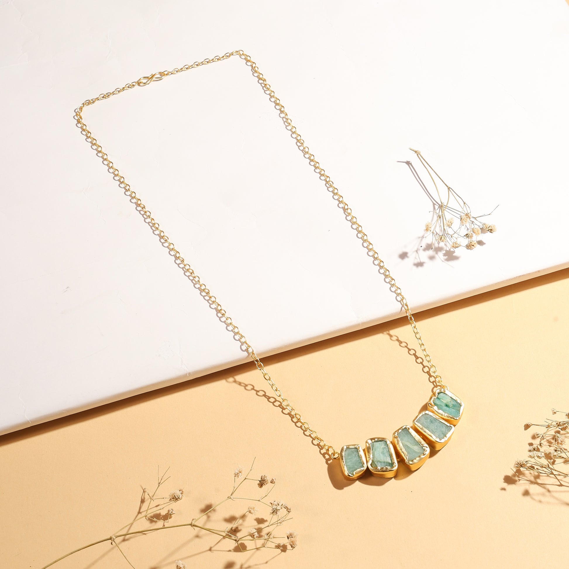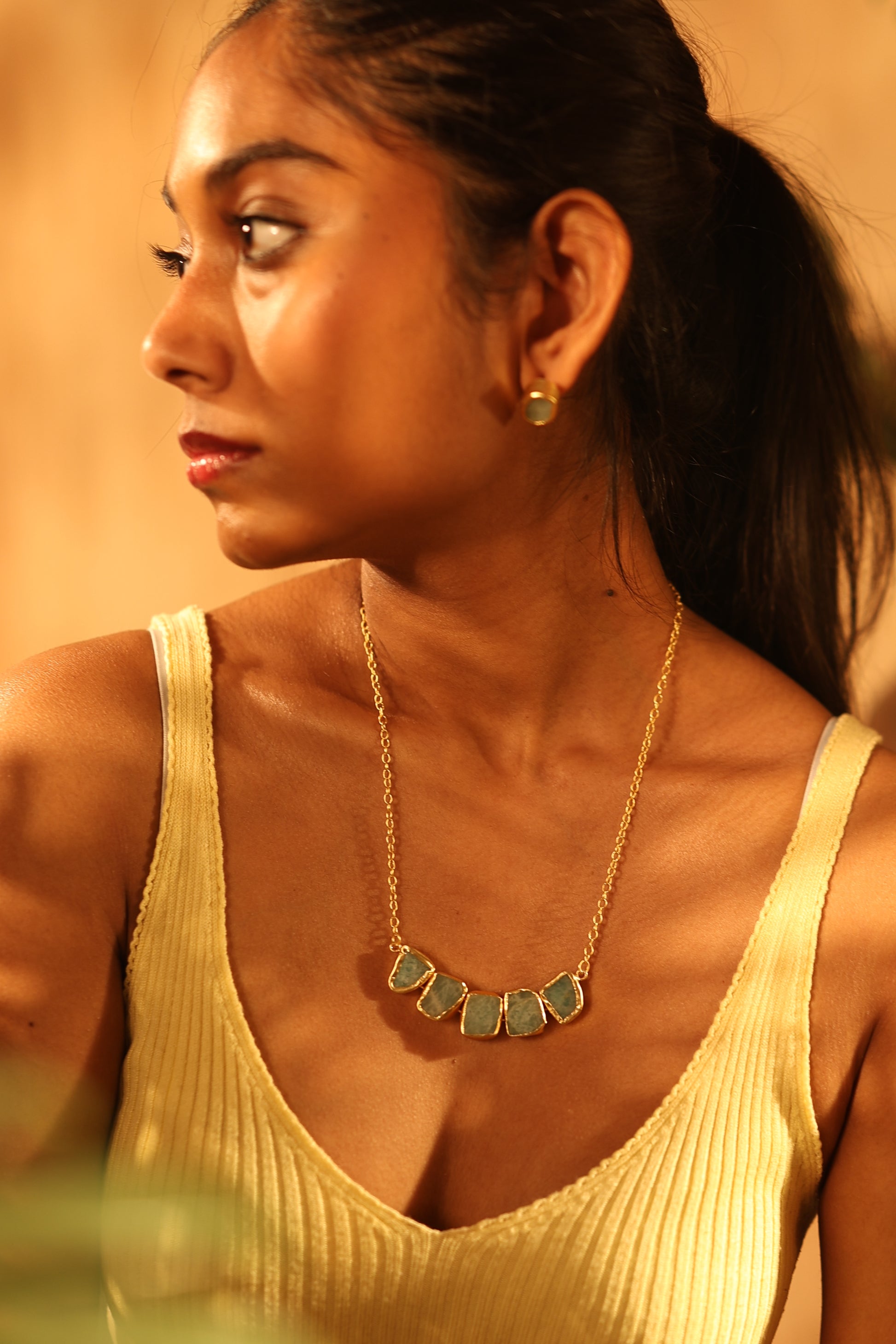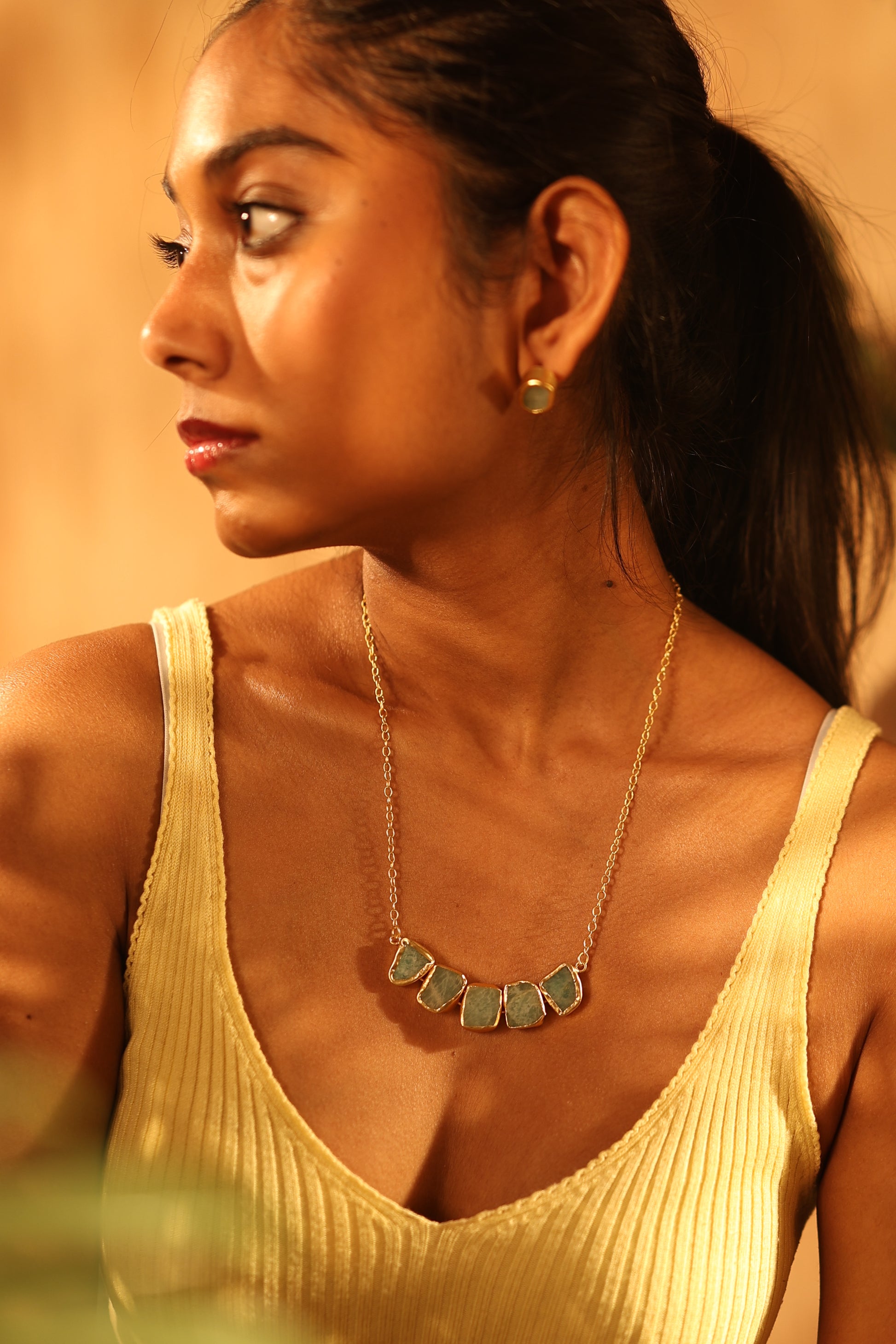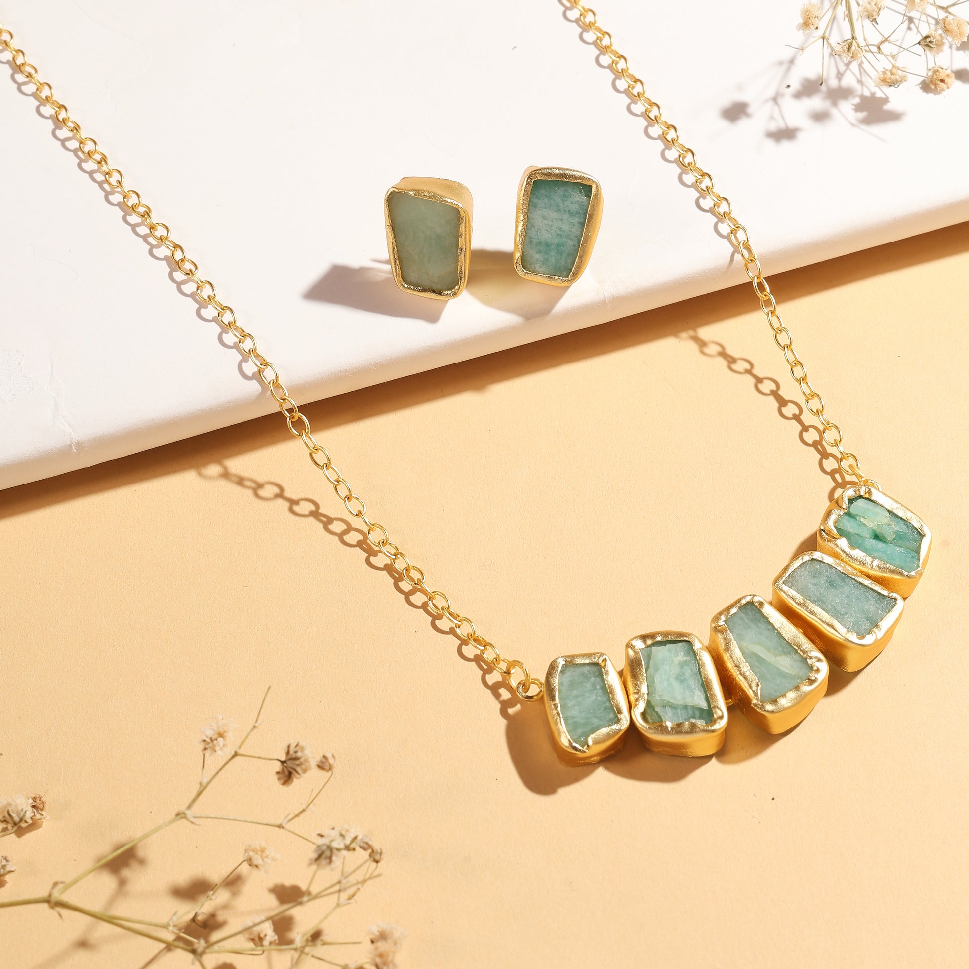 Radiant as the first light of dawn, the Emerald Dawn Set is a celebration of elegance and festivity. Featuring a golden chain adorned with five glistening green stones, paired with matching studs, this handcrafted set captures the freshness of new beginnings and the timeless charm of tradition.