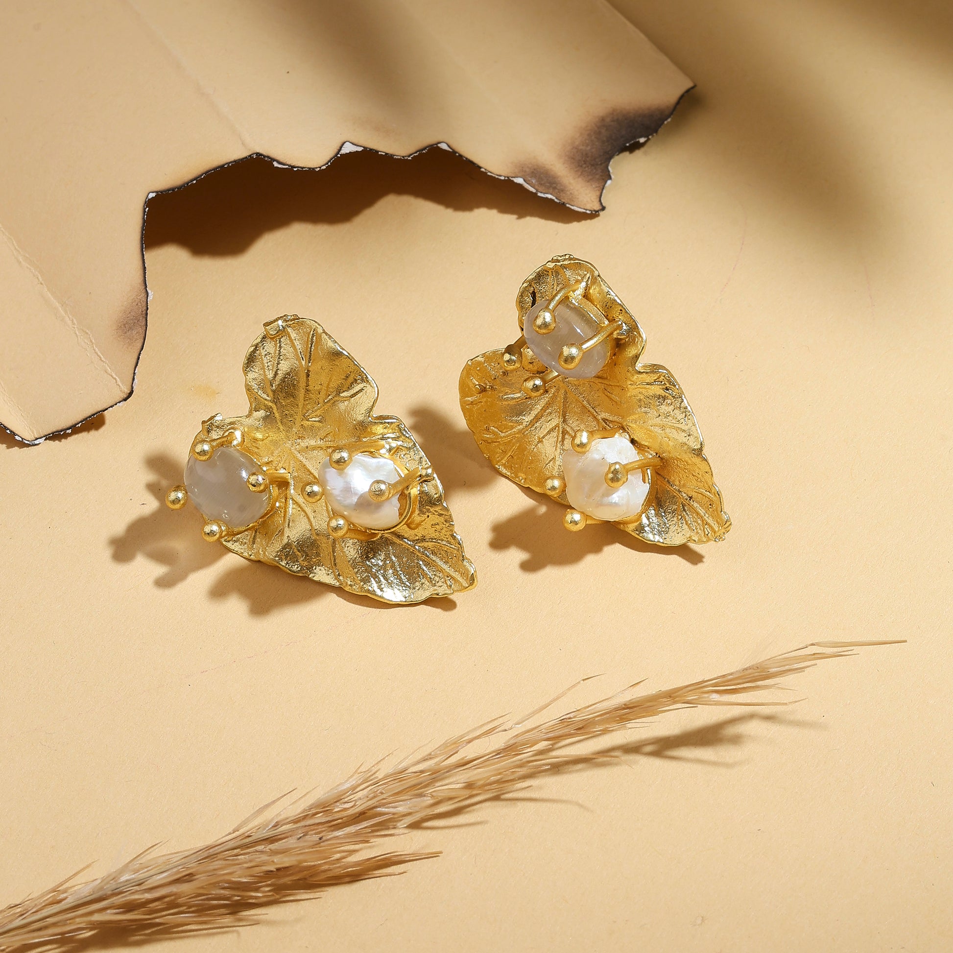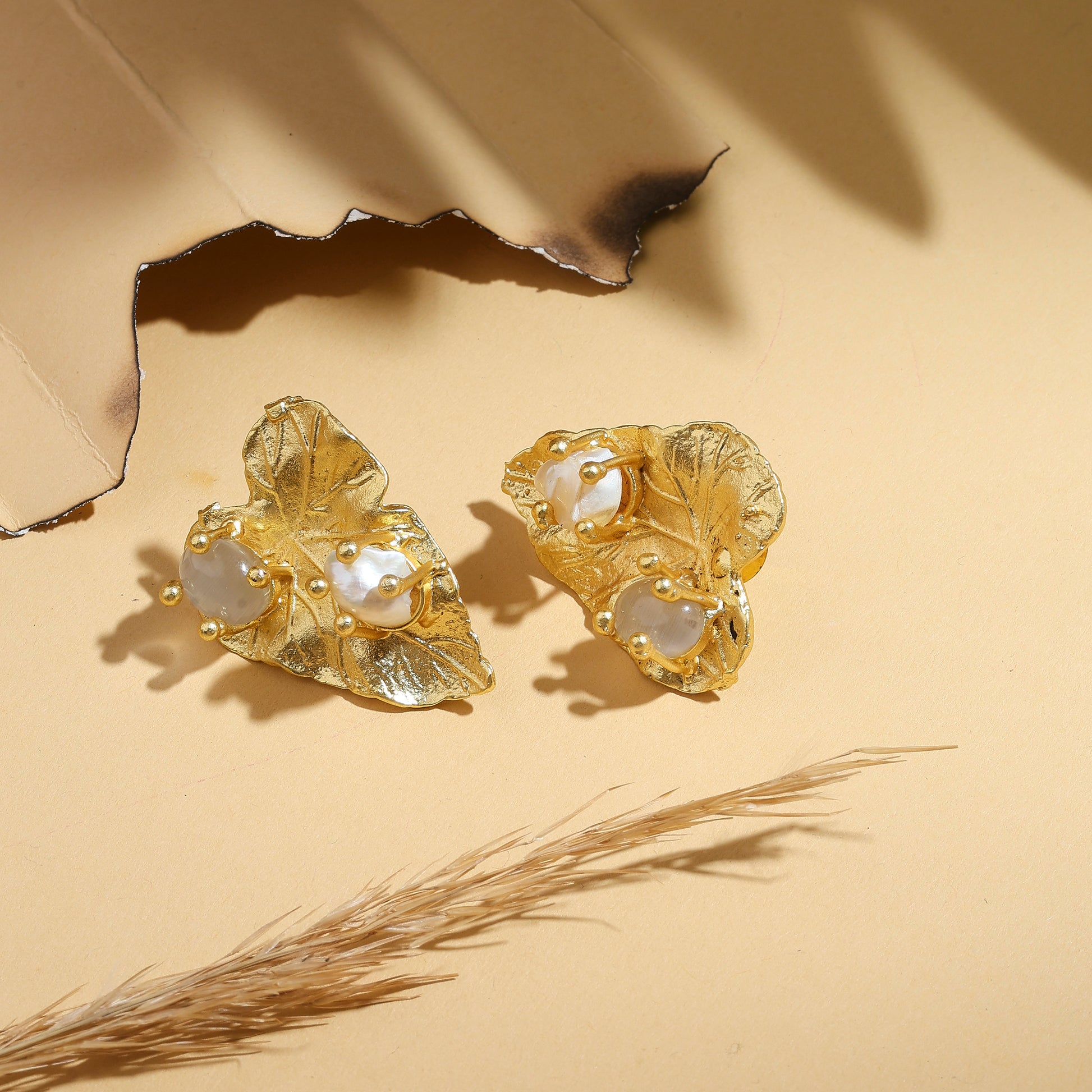 The Aarohi Leaf Earrings are a delicate ode to love and nature’s poetry. Crafted in a golden leaf silhouette, each piece is adorned with luminous pearls that feel like soft dew resting on tender leaves. Their organic design speaks of growth, connection, and the beauty of love that blossoms quietly yet powerfully.