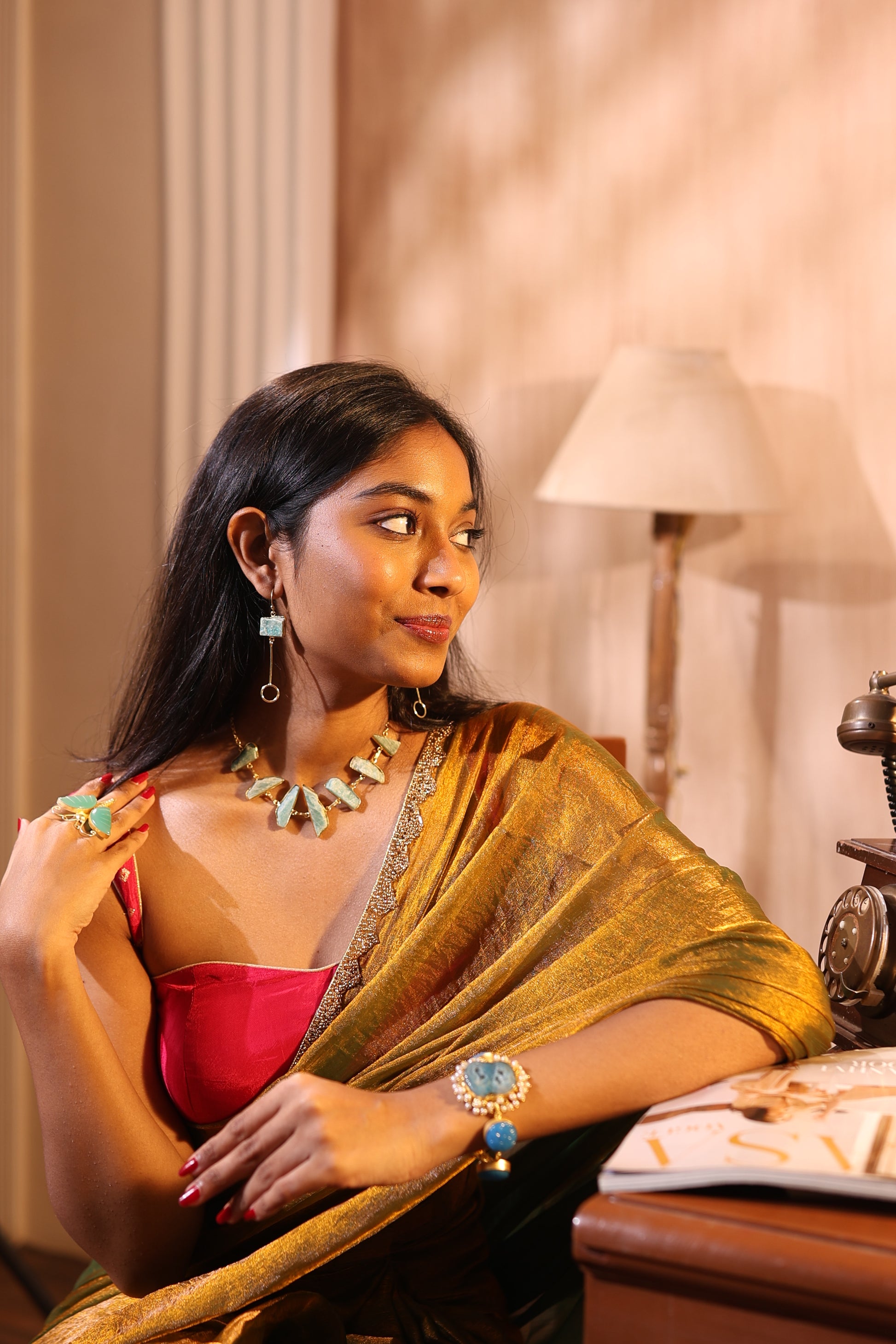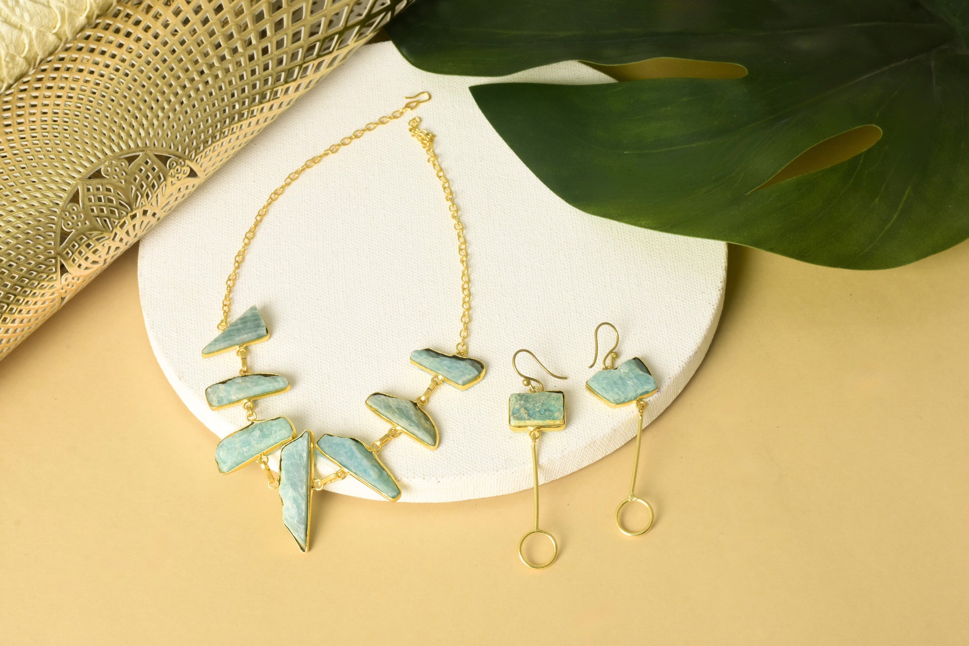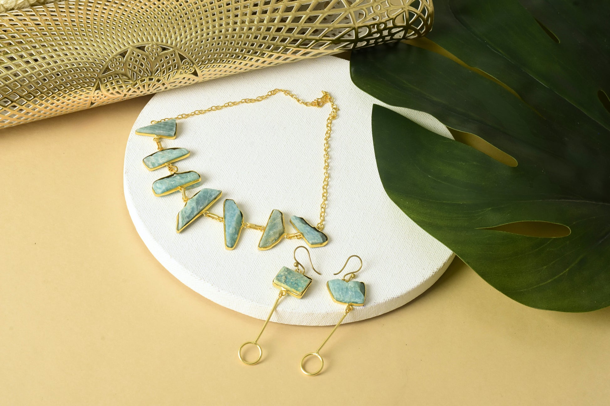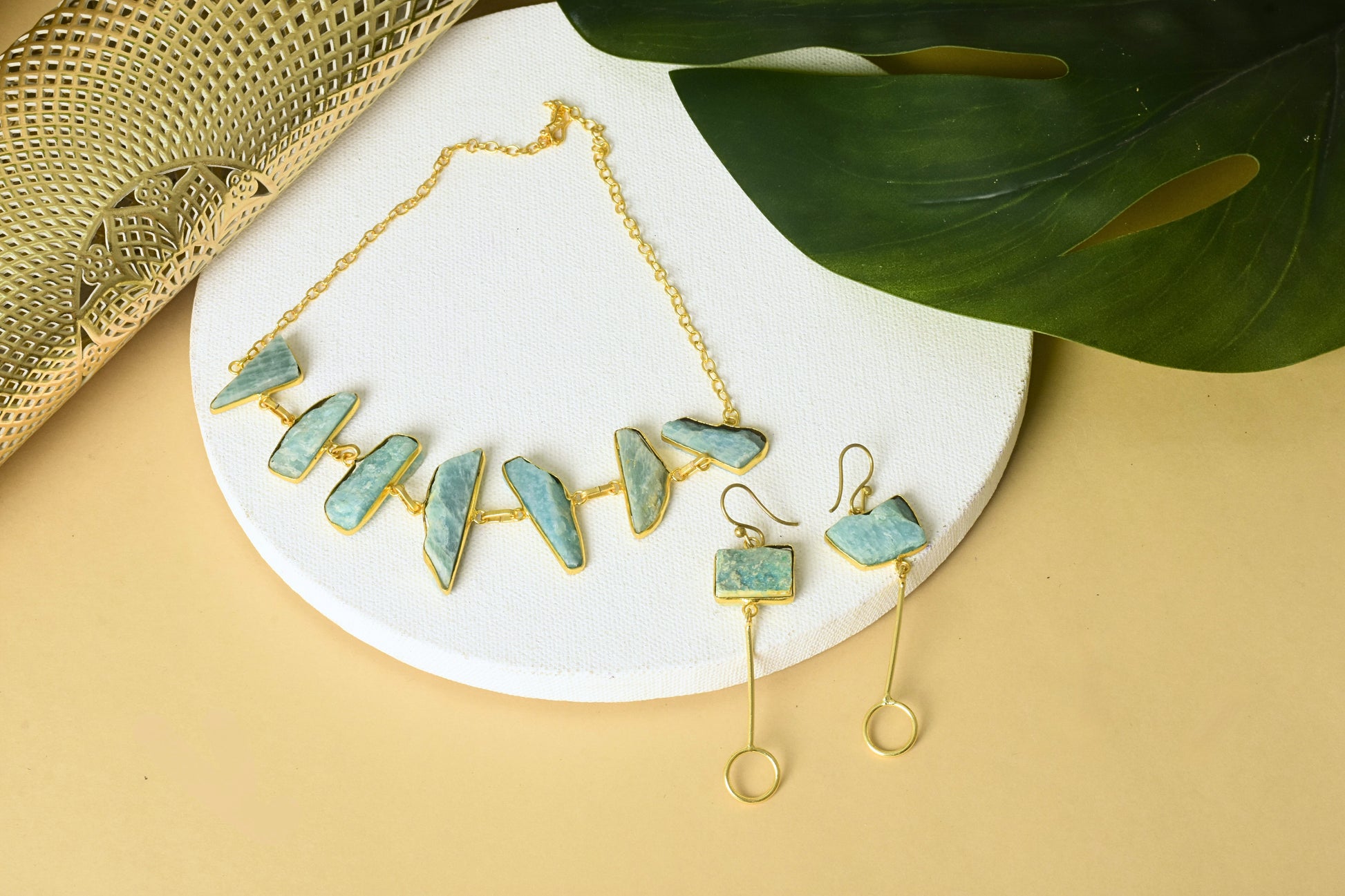 A serene glow, handcrafted for the modern goddess. This stunning necklace set features soothing Amazonite stones known for their calming energy and subtle aqua tones set in radiant, high-quality brass. The handcrafted design pairs a gracefully arranged necklace with matching earrings, creating a balanced blend of earthy beauty and golden sophistication. The natural variations in the stones make each piece one of a kind, while the warm gold finish brings out their inner glow perfect for festive occasions, destination weddings, or soft glam evenings.