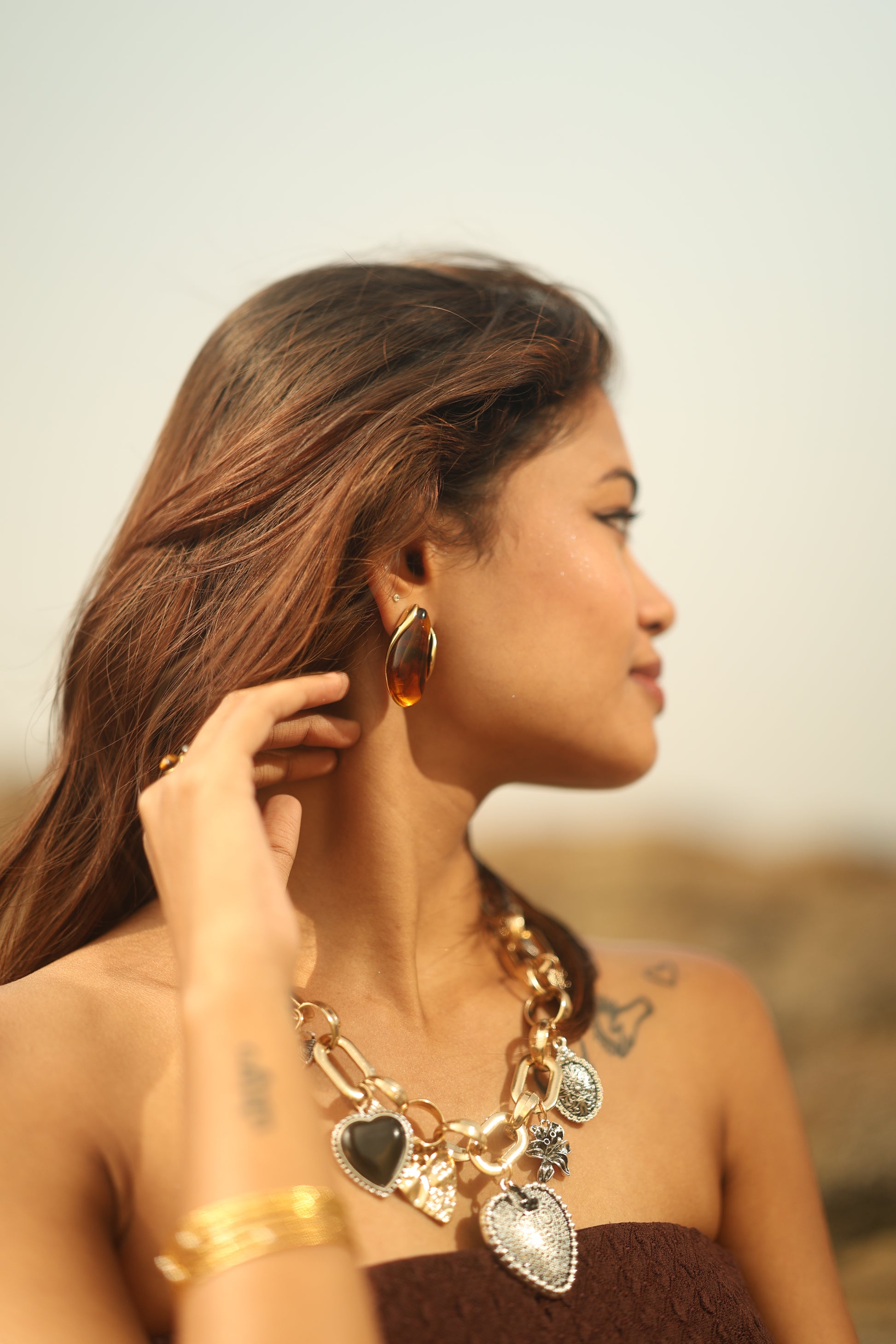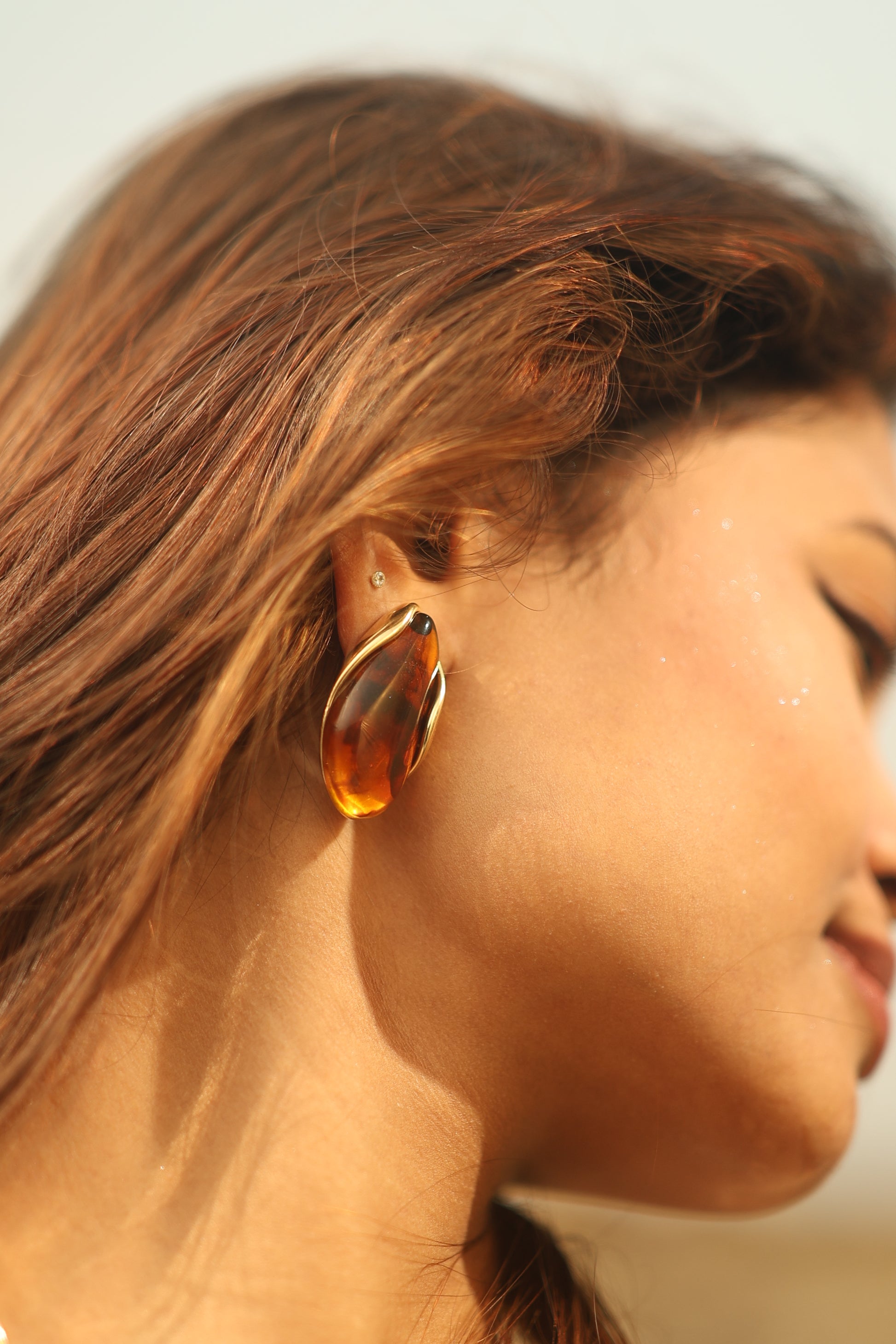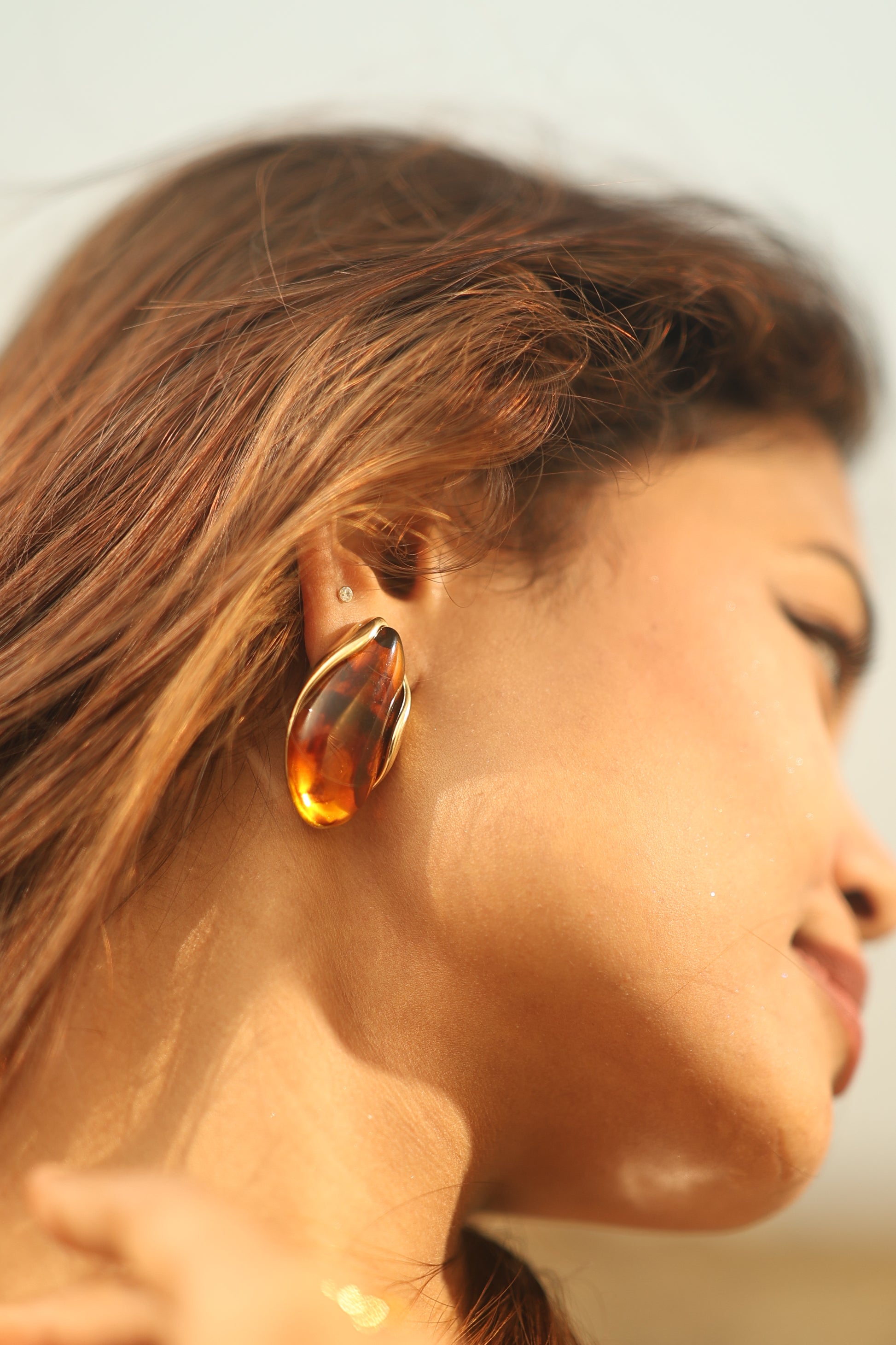 Warm, fluid, and effortlessly bold the Amber Wave Resin Studs are crafted with rich brown resin framed in 18K gold-plated stainless steel. The organic silhouette and amber-like tones bring a vintage warmth with a modern edge, making these studs a perfect statement for both day and evening looks.