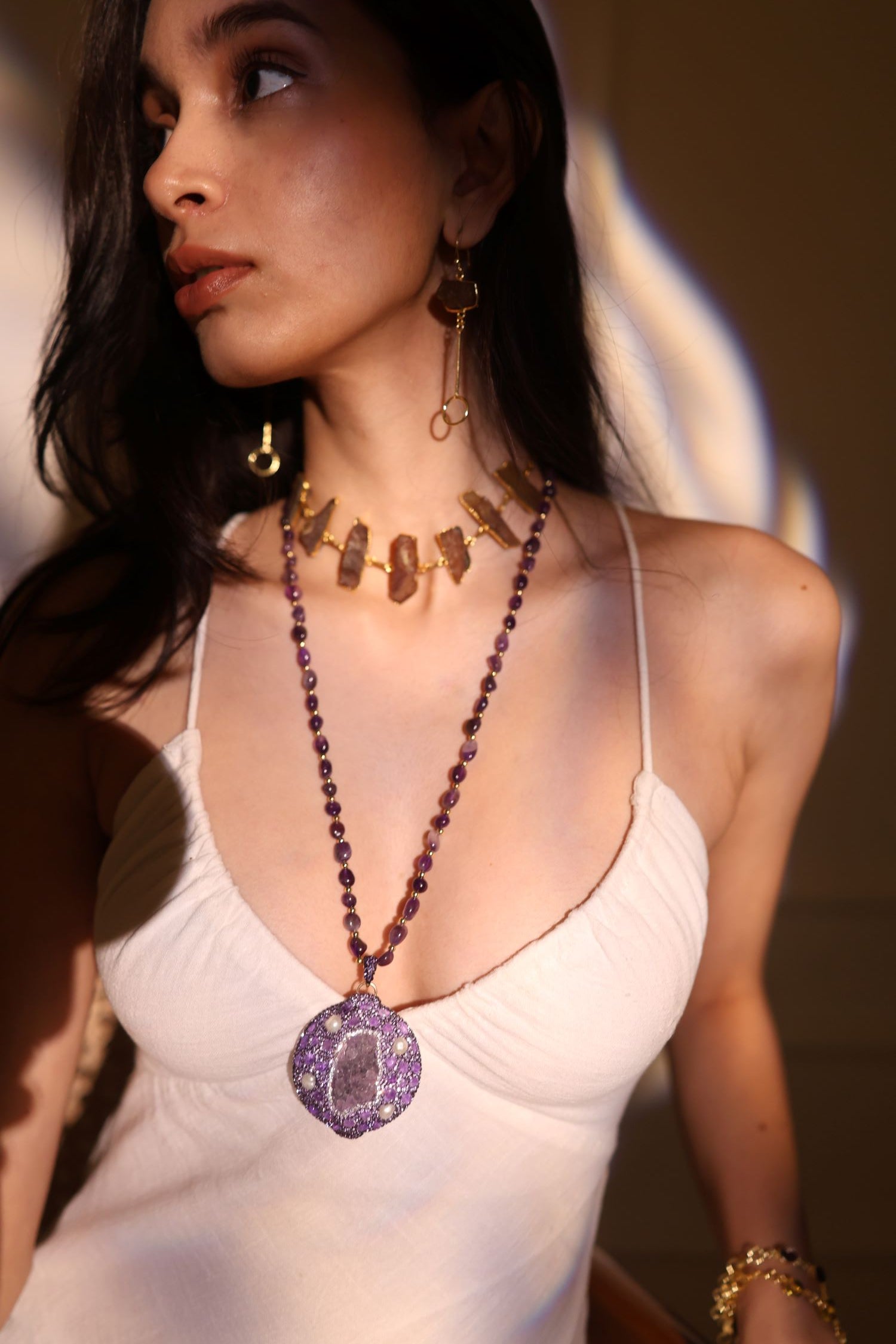 A striking celebration of layered elegance, the Amethyst Auro Set blends bold design with timeless grace. This combo features a statement long amethyst necklace paired beautifully with a delicate choker, creating a perfect harmony between modern layering and classic charm. The rich violet tones of amethyst stones add a regal, soulful touch, while the handcrafted detailing enhances its artisanal beauty.