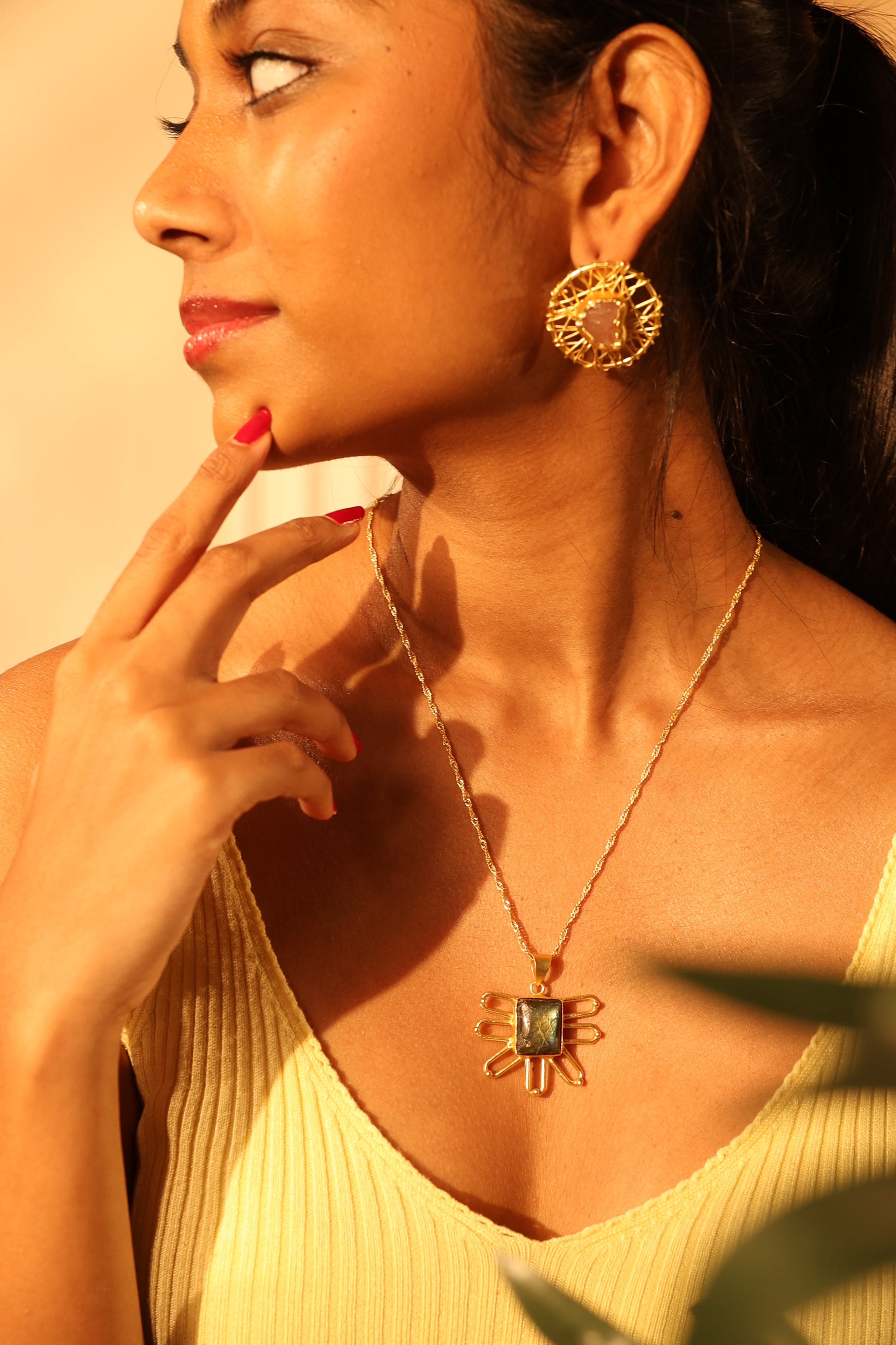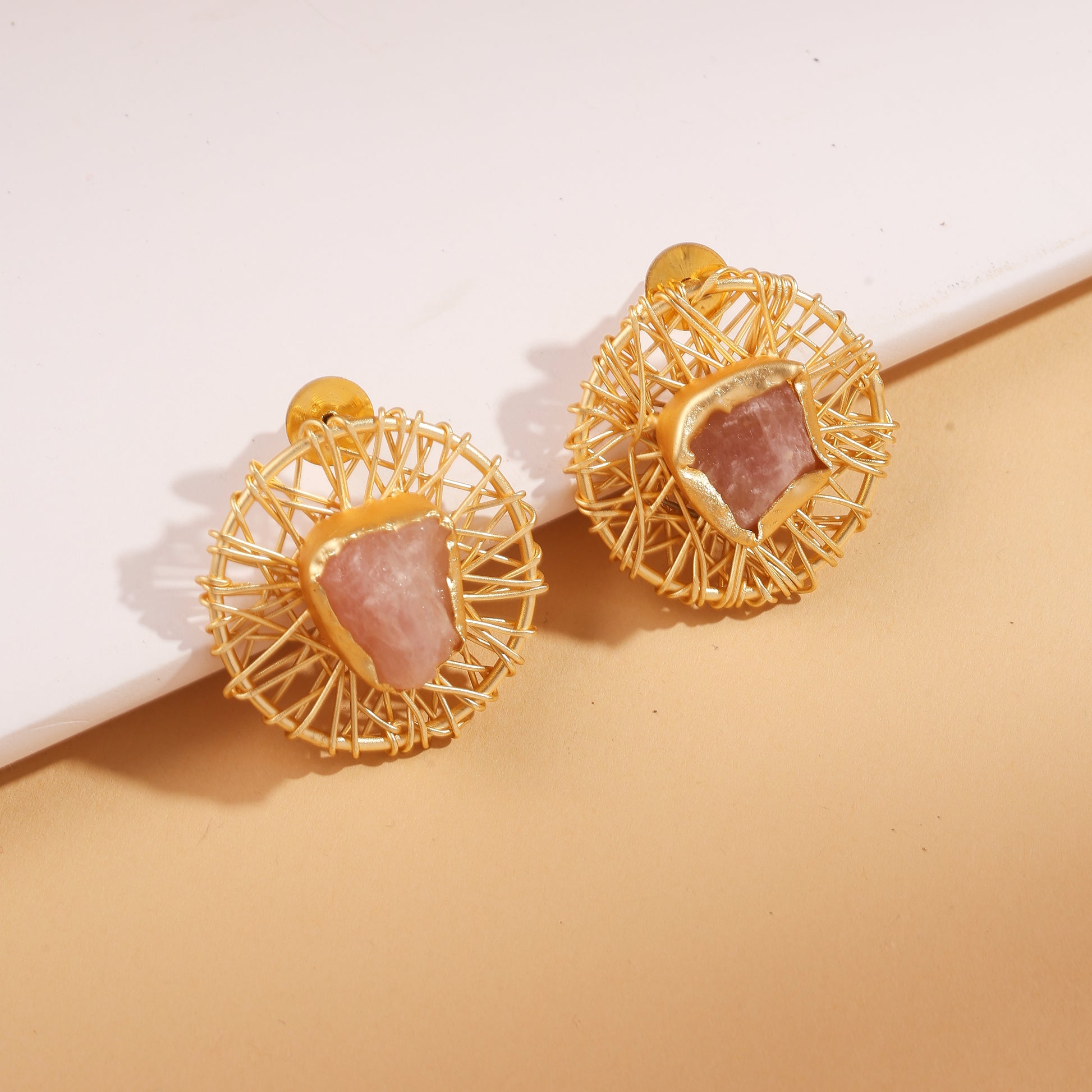 The Aurora Blush Earrings embody softness wrapped in strength. Their handcrafted brass lattice design radiates golden brilliance, while a raw rose quartz stone rests at the center, symbolizing love and calm energy. Lightweight yet striking, these earrings add a touch of modern romance to any look from festive celebrations to everyday elegance.