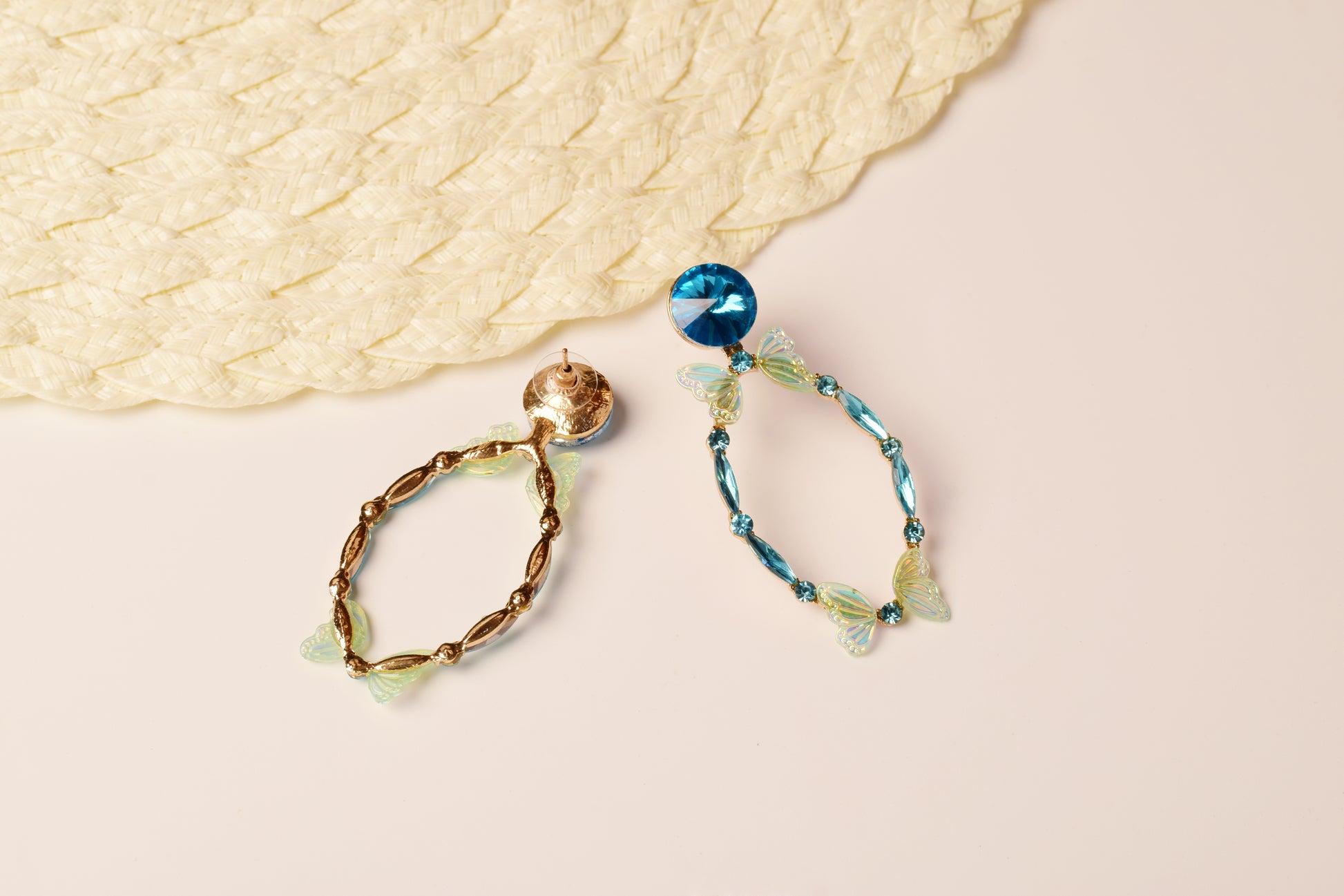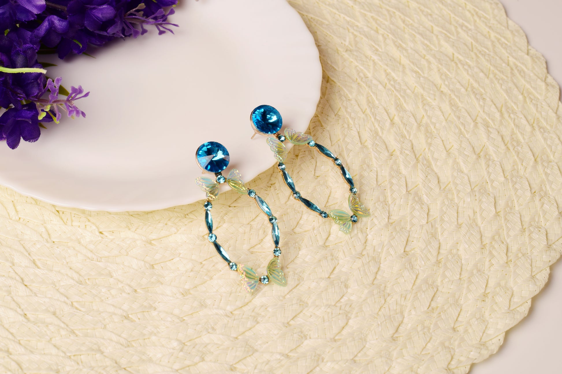 Let your style take flight with our Azure Flutter Hoop Earrings, handcrafted to capture the magic of movement and light. Made with radiant aqua stones and iridescent butterfly motifs, these earrings bring a dreamy, whimsical charm to every look. The bold blue stud adds a striking pop of color, while the delicately arranged crystals and butterflies form an elegant oval silhouette.