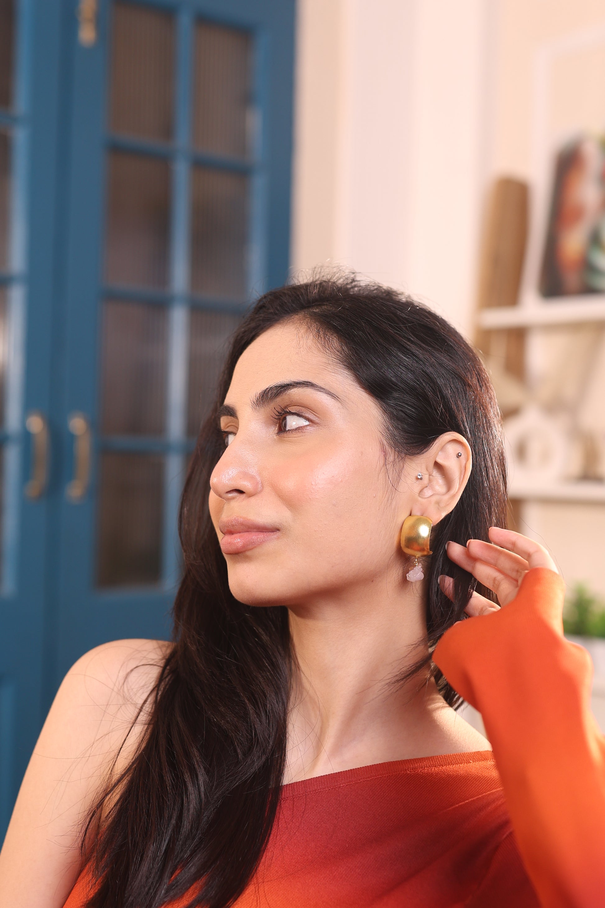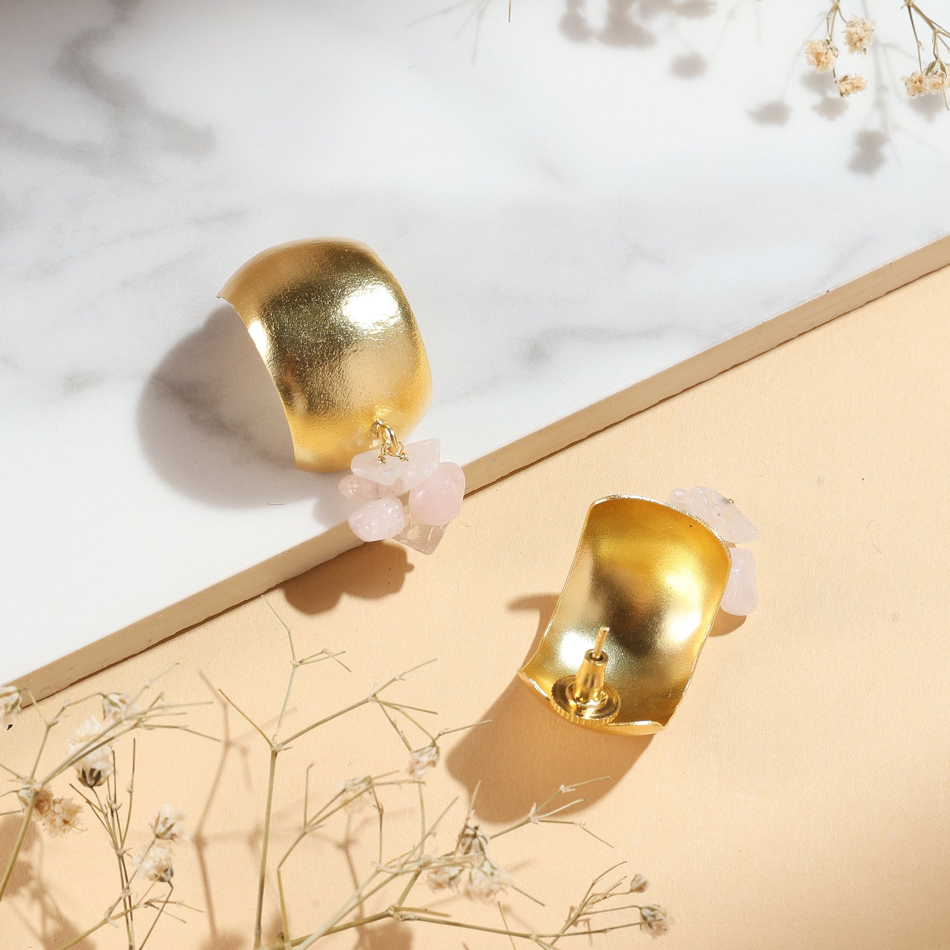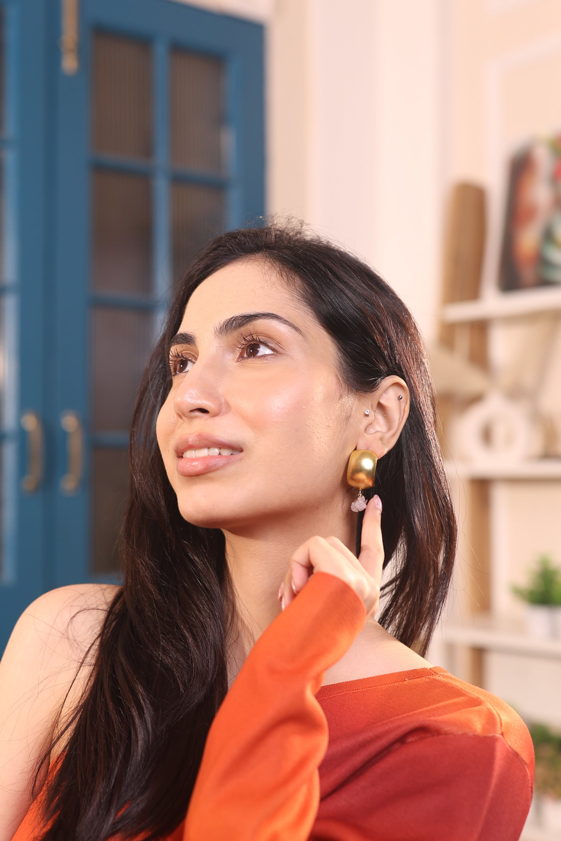 The Blush Drape earrings bring a soft, romantic twist to a bold silhouette. Handcrafted in radiant gold with a sculptural arc design, these earrings are adorned with clusters of pink stones that bloom delicately at the base. Striking yet feminine, they are perfect for festive evenings, weddings, or whenever you want to add a graceful pop of color to your look.