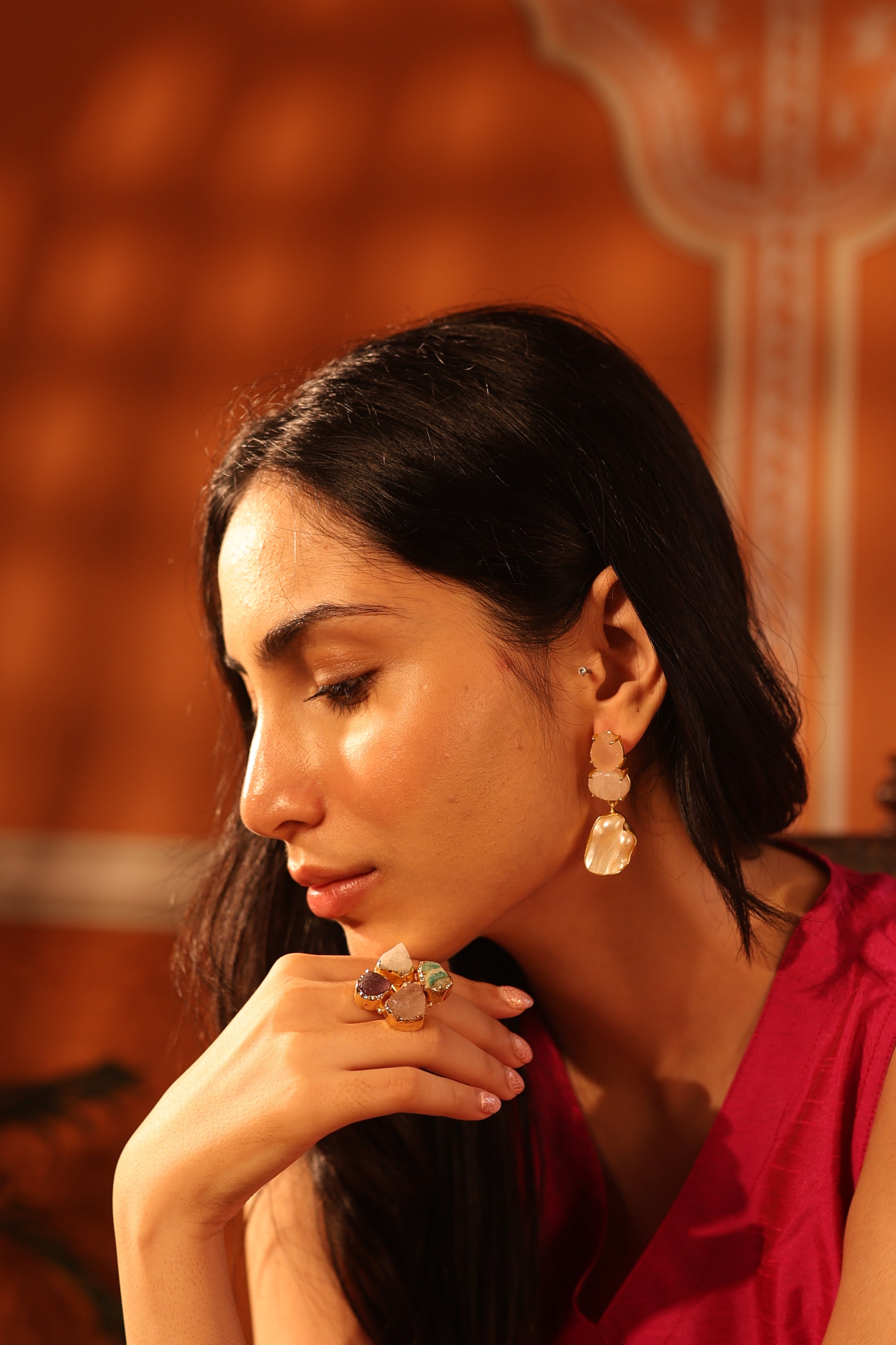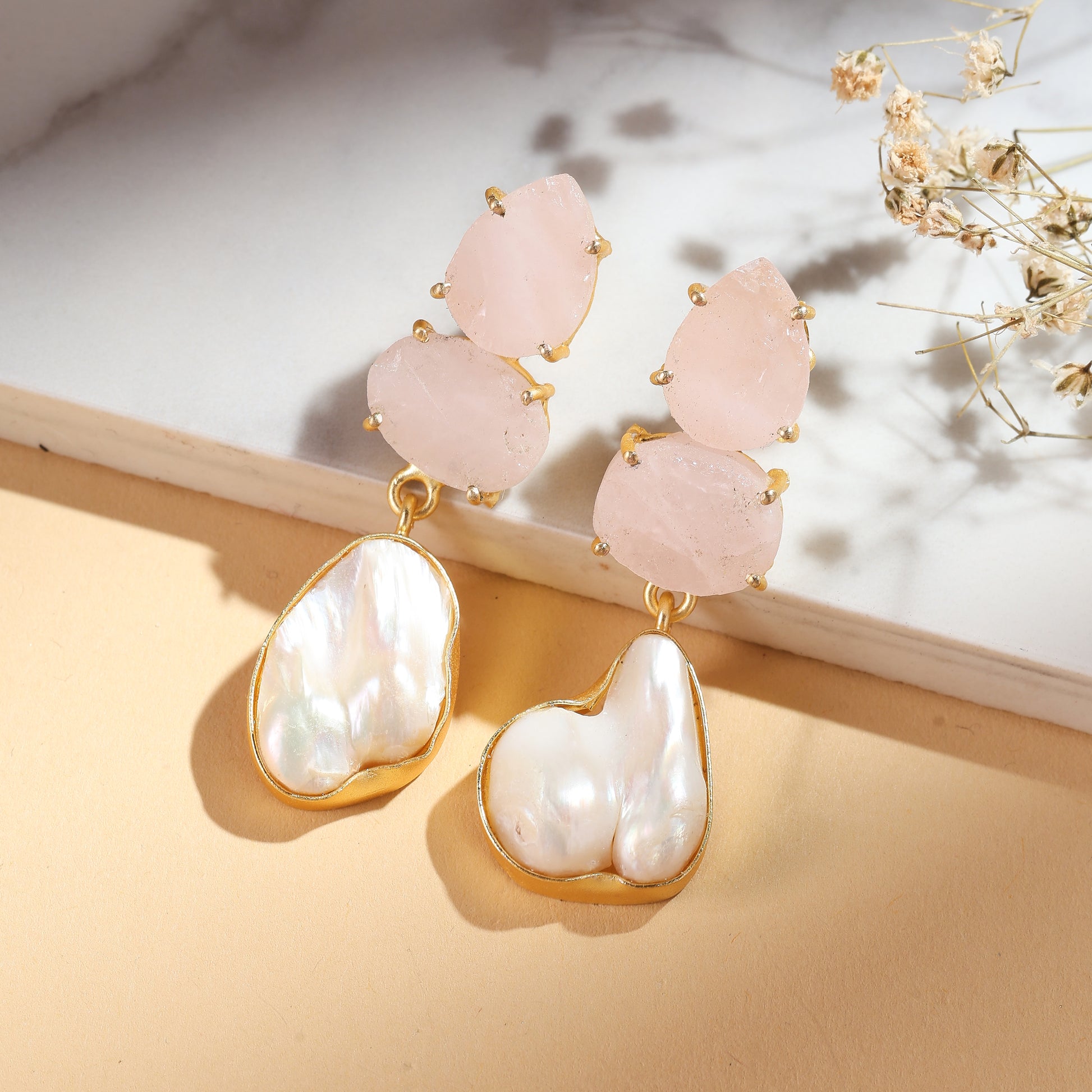 Delicate yet striking, the Blush Glow Earrings feature a graceful cascade of raw Rose Quartz stones paired with luminous baroque pearls. The soft pink hues of the quartz exude love and serenity, while the organic shimmer of the pearls adds timeless elegance. Set in a radiant gold-plated frame, these handcrafted earrings are perfect for adding a romantic glow to festive celebrations or intimate evenings. A piece that beautifully blends raw beauty with refined charm, making it a must-have for your jewelry collection.