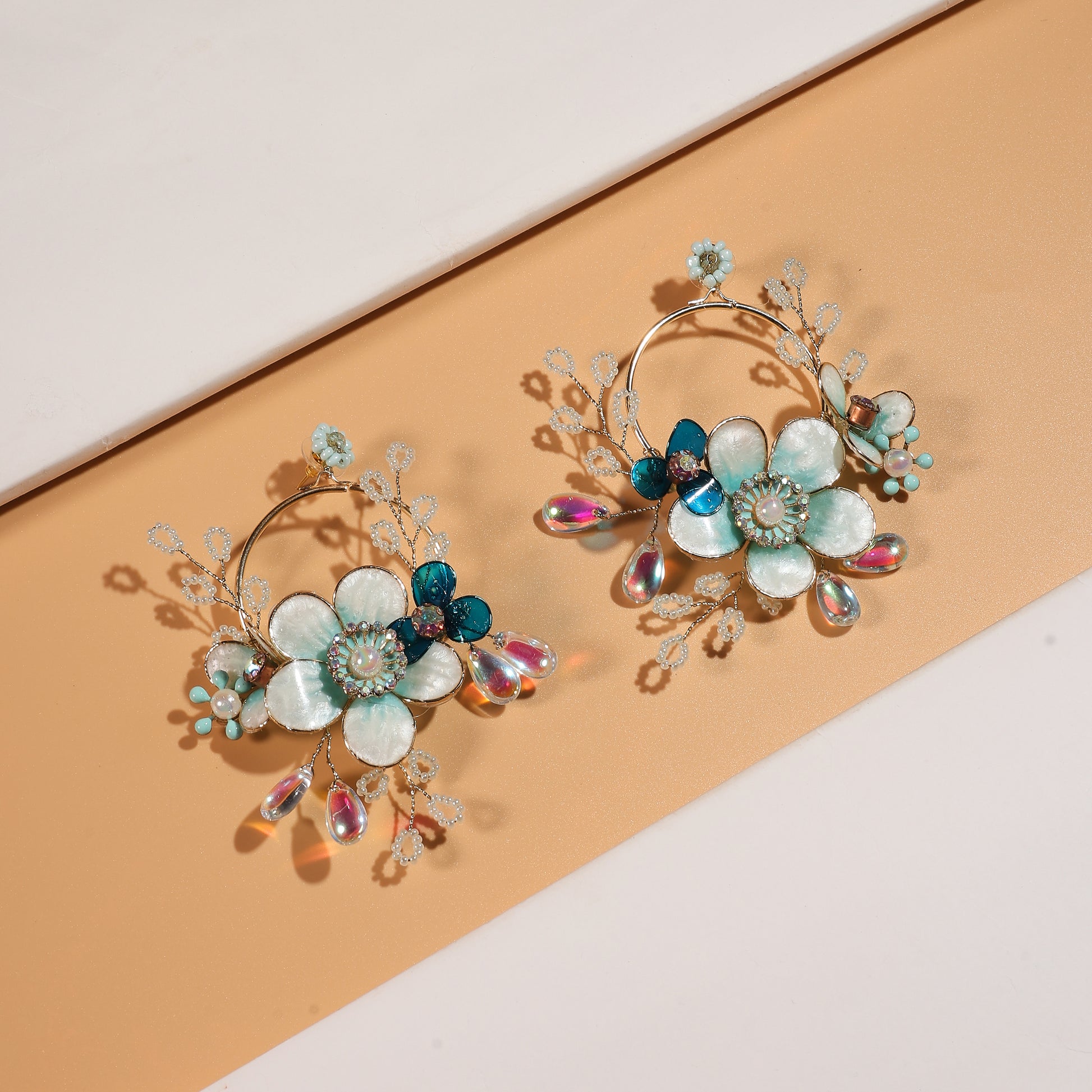 The Celeste Bloom Earrings are a breathtaking ode to festive elegance, blending floral artistry with radiant sparkle. Crafted in a delicate hoop silhouette, these earrings feature hand-assembled petals in shimmering aqua tones, accentuated by iridescent drops and crystal detailing. The intricate bead branches add a touch of whimsy, while the bold flower centerpiece makes it a statement-worthy piece.