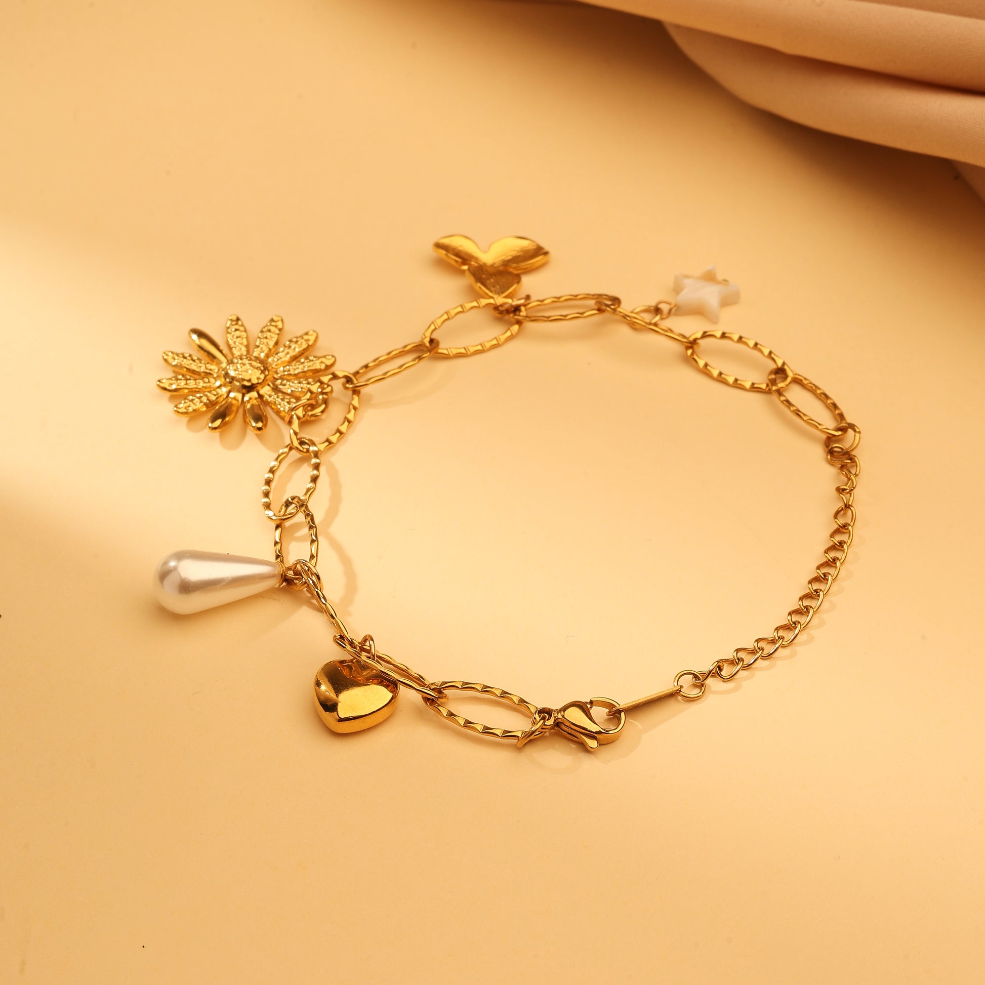 The Celeste Charm Bracelet is crafted in durable stainless steel and finished with luxurious 18K gold plating, designed to shine beautifully while staying tarnish-resistant for everyday wear. Adorned with delicate charms a blooming daisy, soft pearl drop, star detail, butterfly accent, and textured gold links each element brings its own meaning: growth, light, grace, transformation. It’s playful yet refined. Feminine yet powerful.