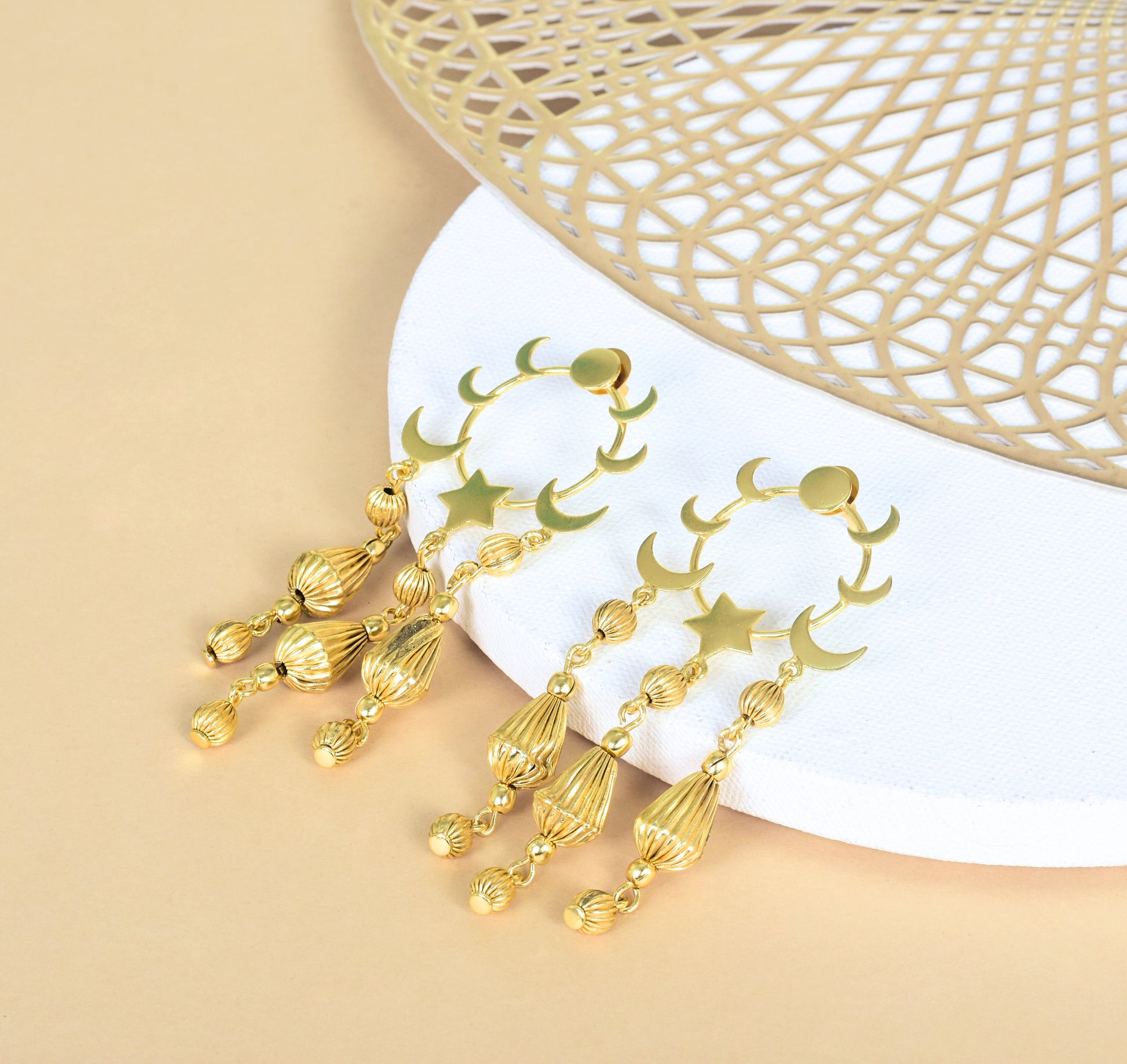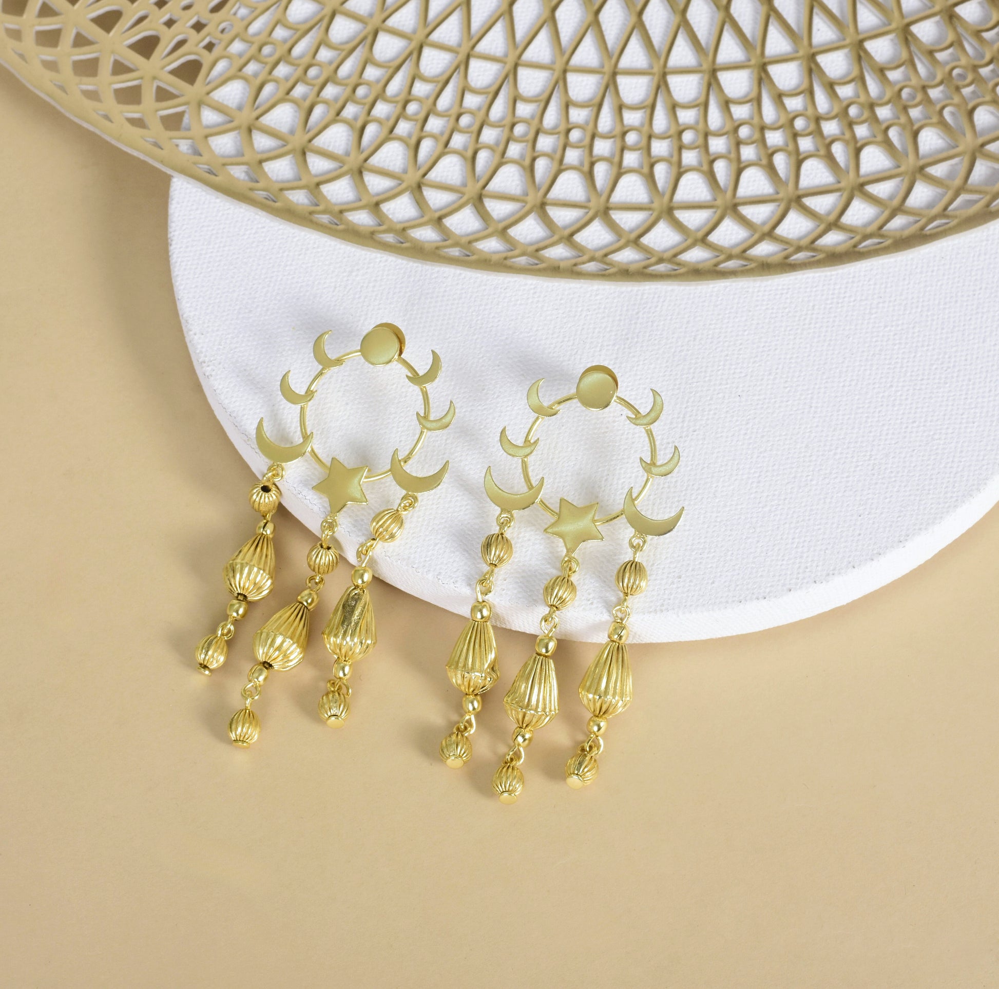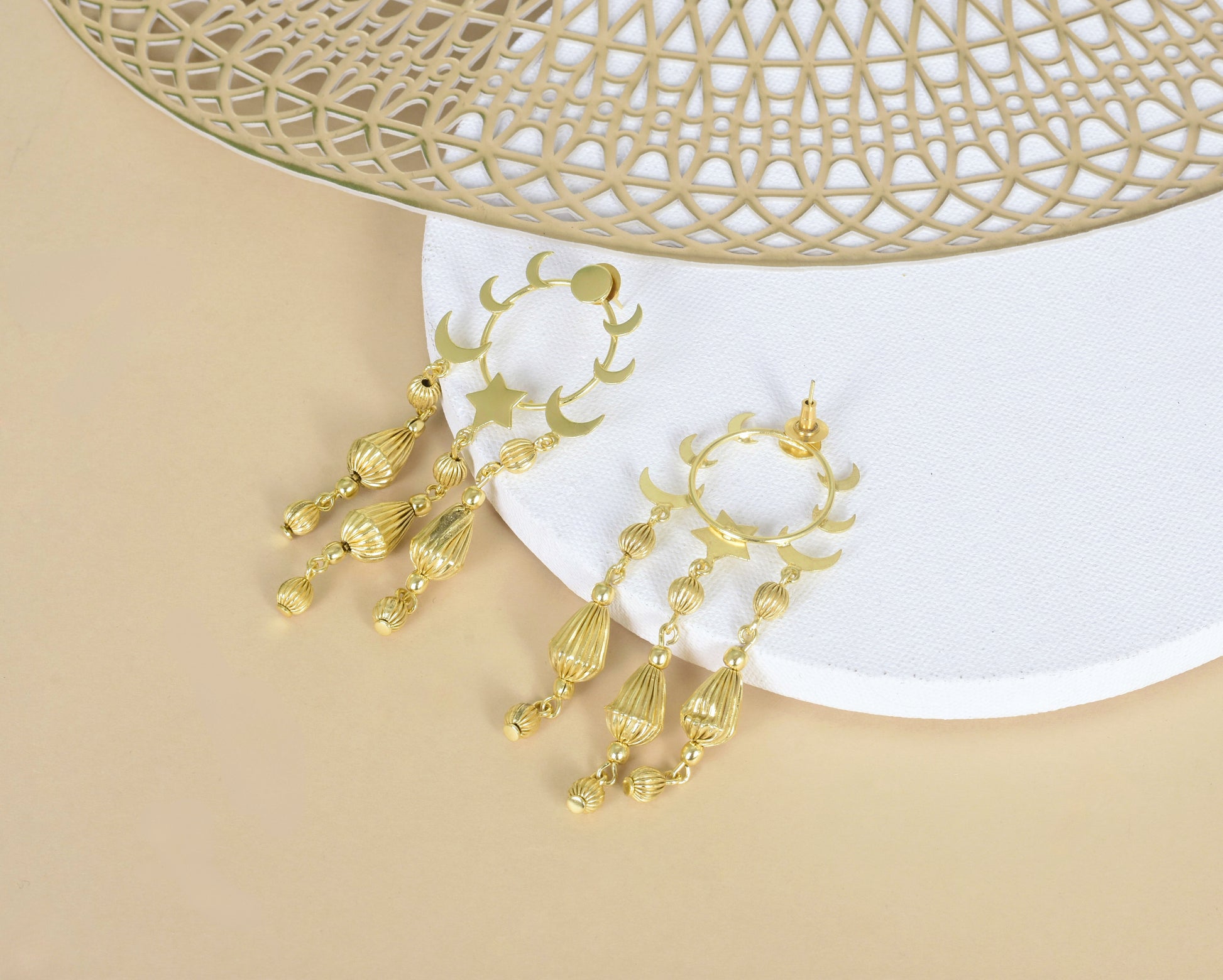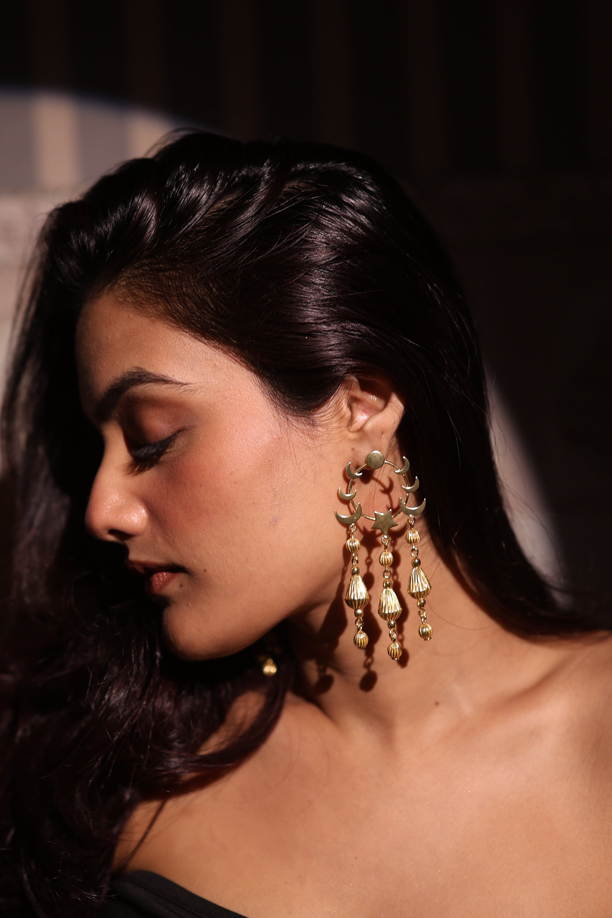 A celebration of moons, stars, and everything magical. The Celestial Rhythm Earrings feature a stunning play of polished high quality pure brass crescents and textured gold-toned danglers lightweight, whimsical, and full of movement. Whether you're dancing under the stars or chasing your own light, these earrings were made to shine with you. Handcrafted with love, made for the dreamers.