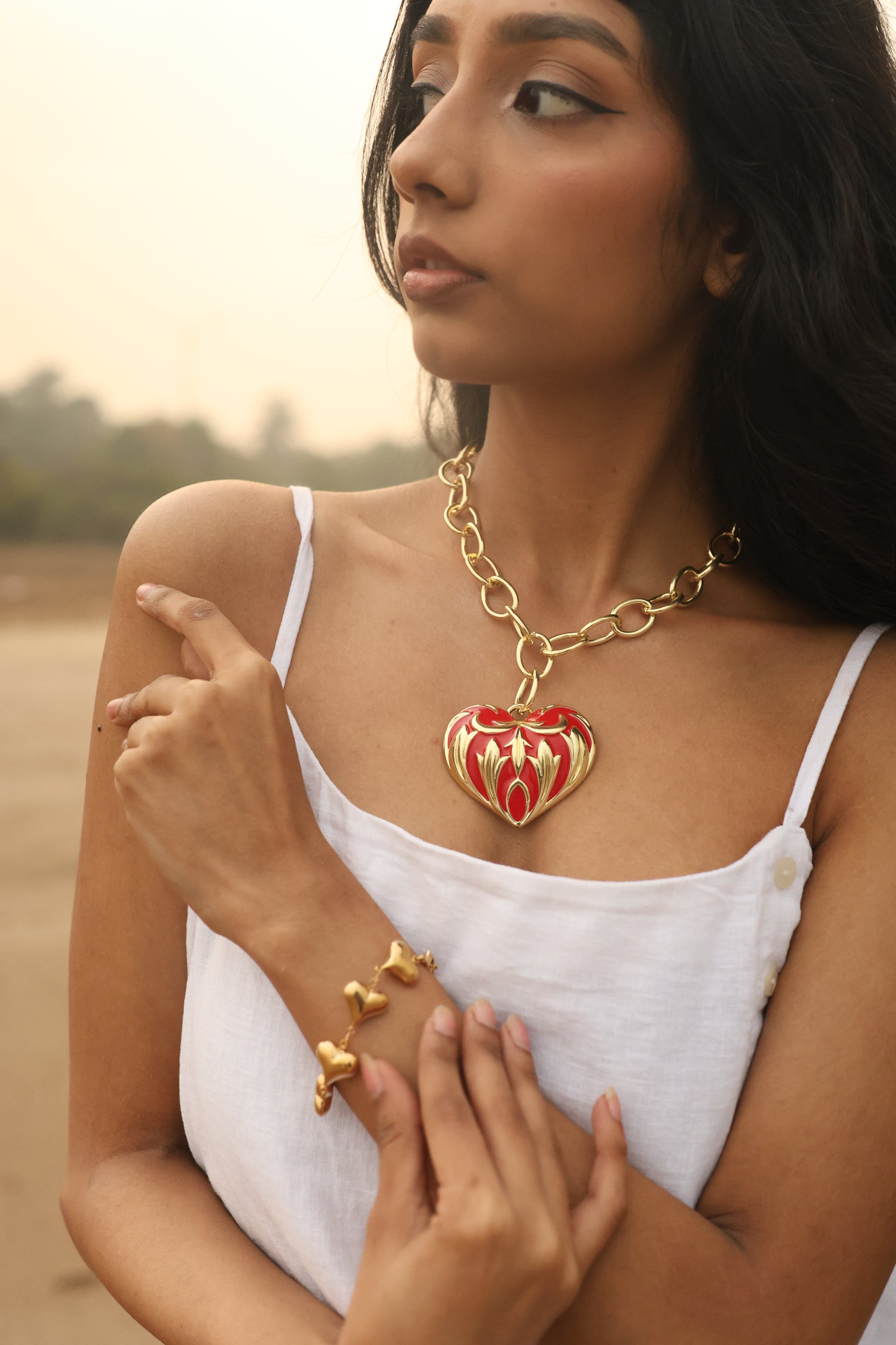 The Coeur Bold Heart Bracelet features high-shine sculpted heart links that make an unapologetic statement of love and confidence. Crafted from durable stainless steel and finished with luxurious 18K gold plating, this piece is designed to hold its glow—day after day.