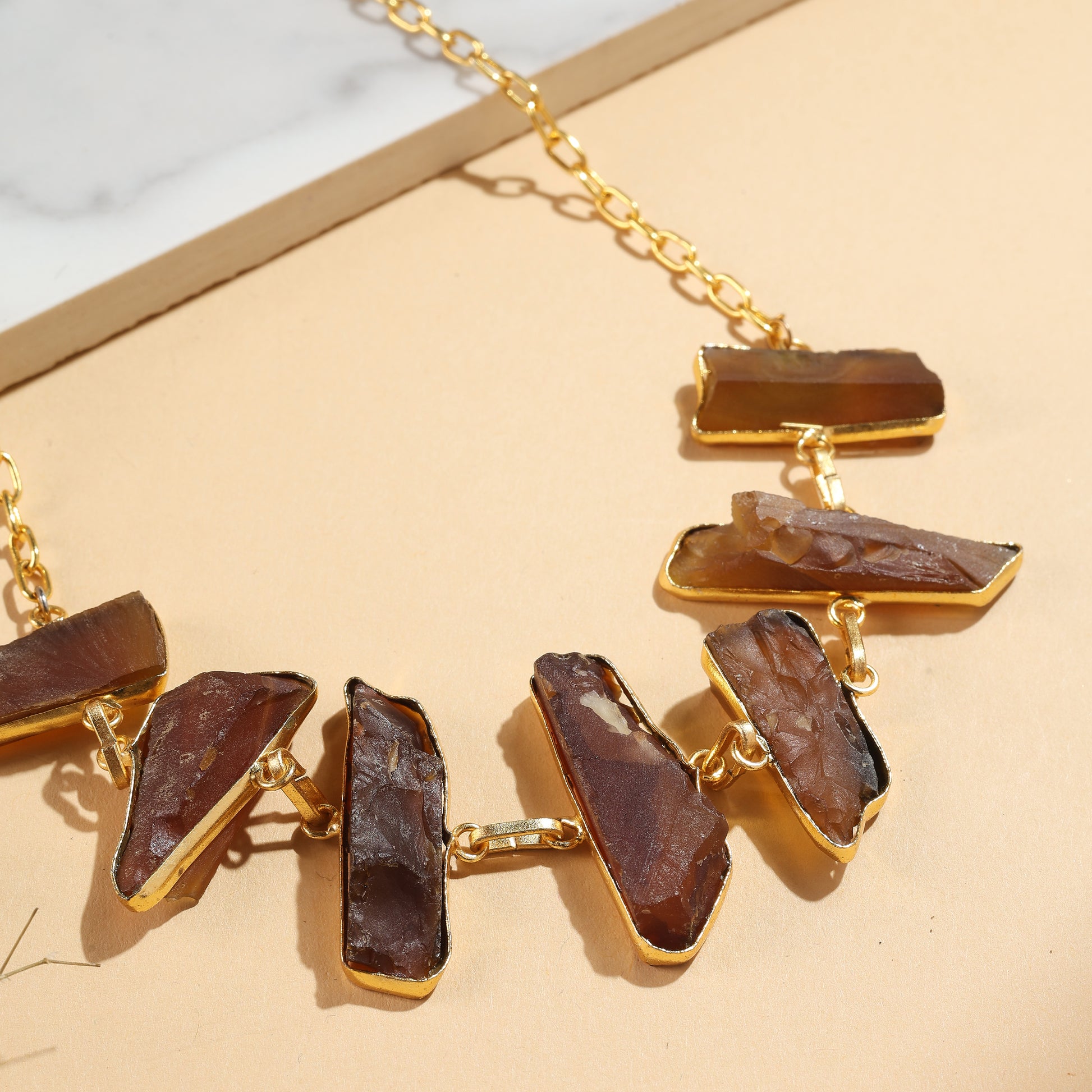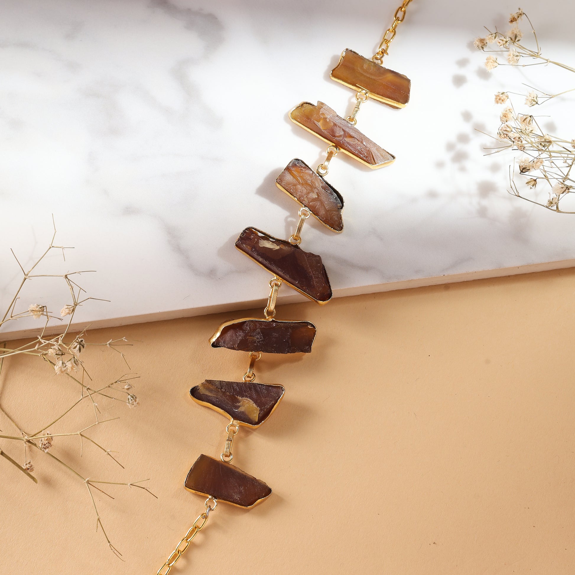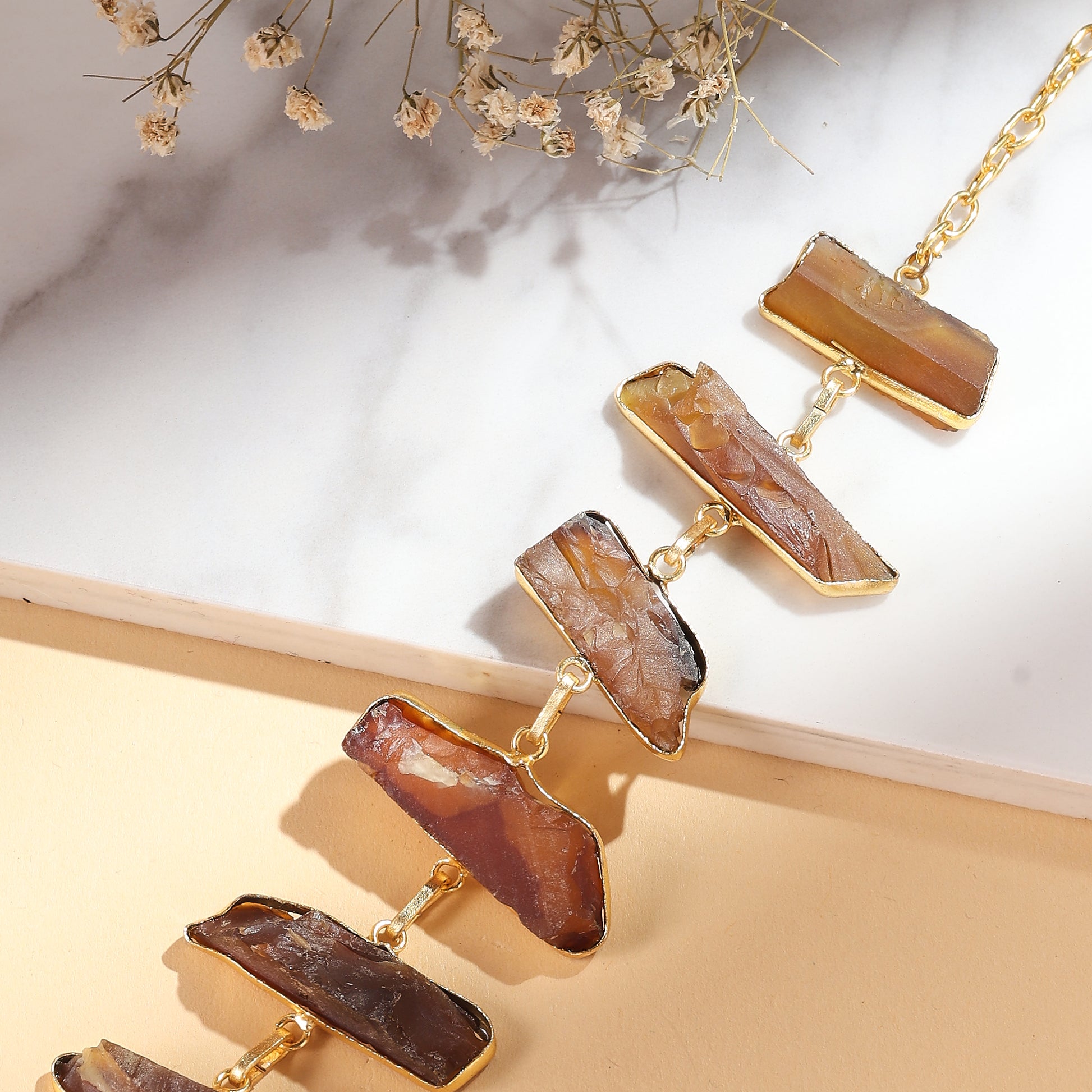 Grounded in nature, yet striking in design the Earthen Grace Set celebrates the beauty of raw stones in their most natural form. The necklace features asymmetrical Jasper stones plated in radiant gold, strung on a delicate chain, while the matching earrings balance the earthy roughness with sleek geometric drops.