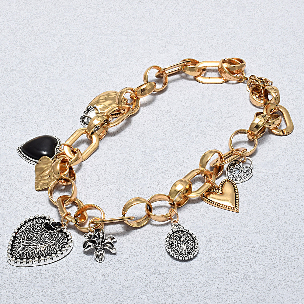 Designed as a celebration of individuality, the Eclectic Heart Charm Necklace brings together bold statement links and a curated mix of symbolic charms. Featuring textured hearts, engraved motifs, and mixed-metal accents, this piece feels like a collection of stories worn close to the heart.