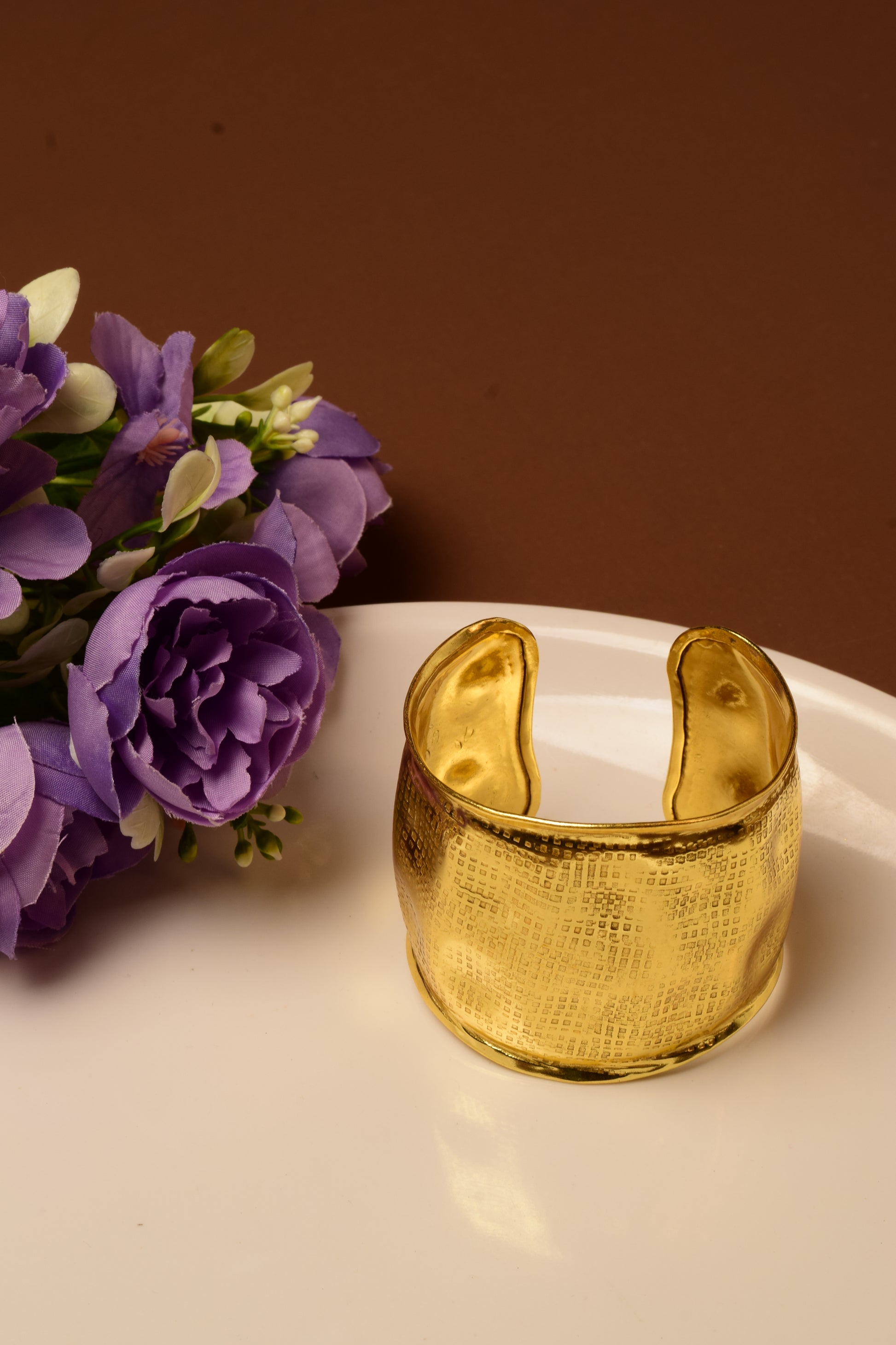 Crafted from high-quality brass and dipped in gold, this grid-textured cuff is giving boss energy. Chic, bold, and made to turn heads.