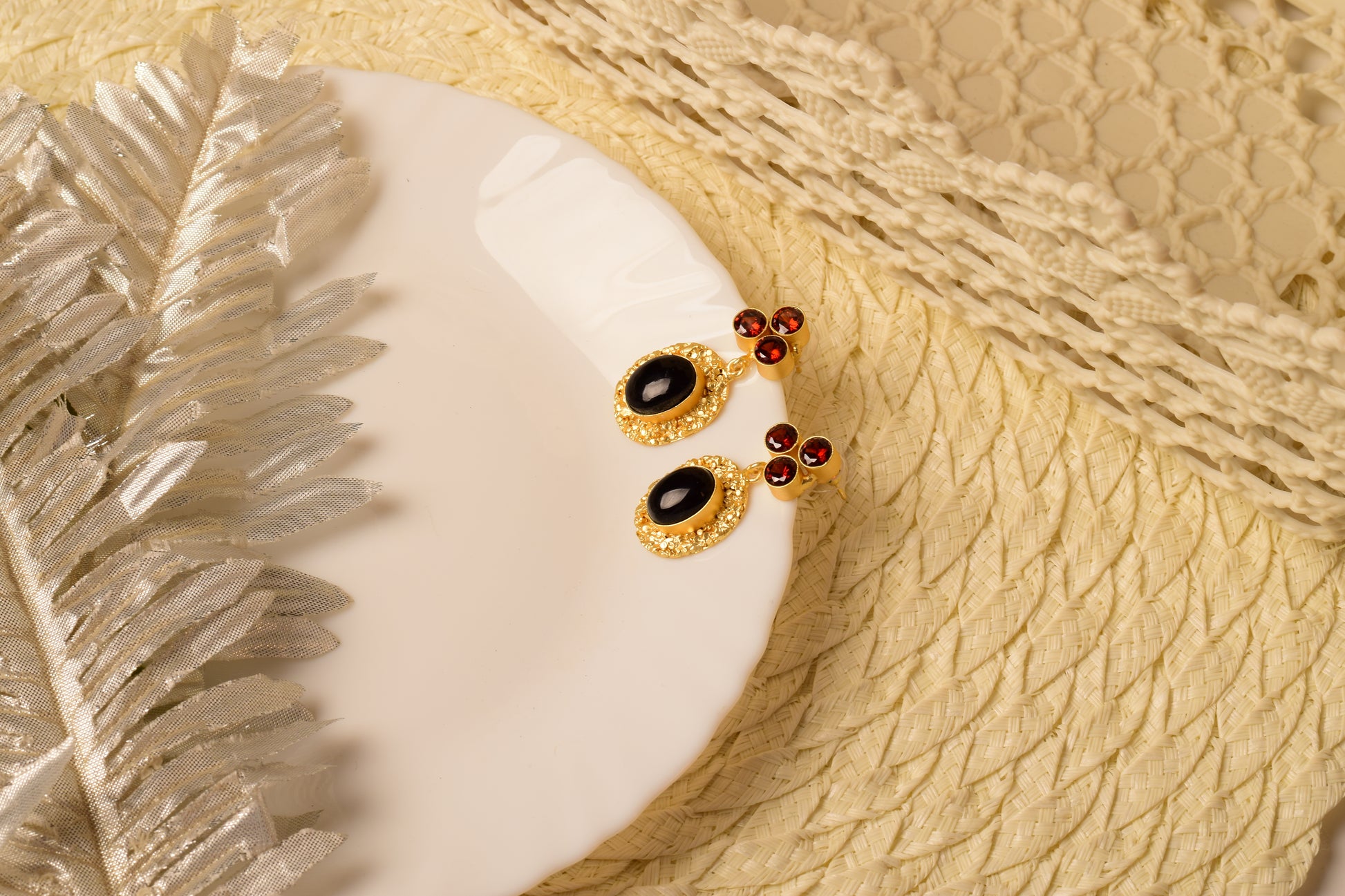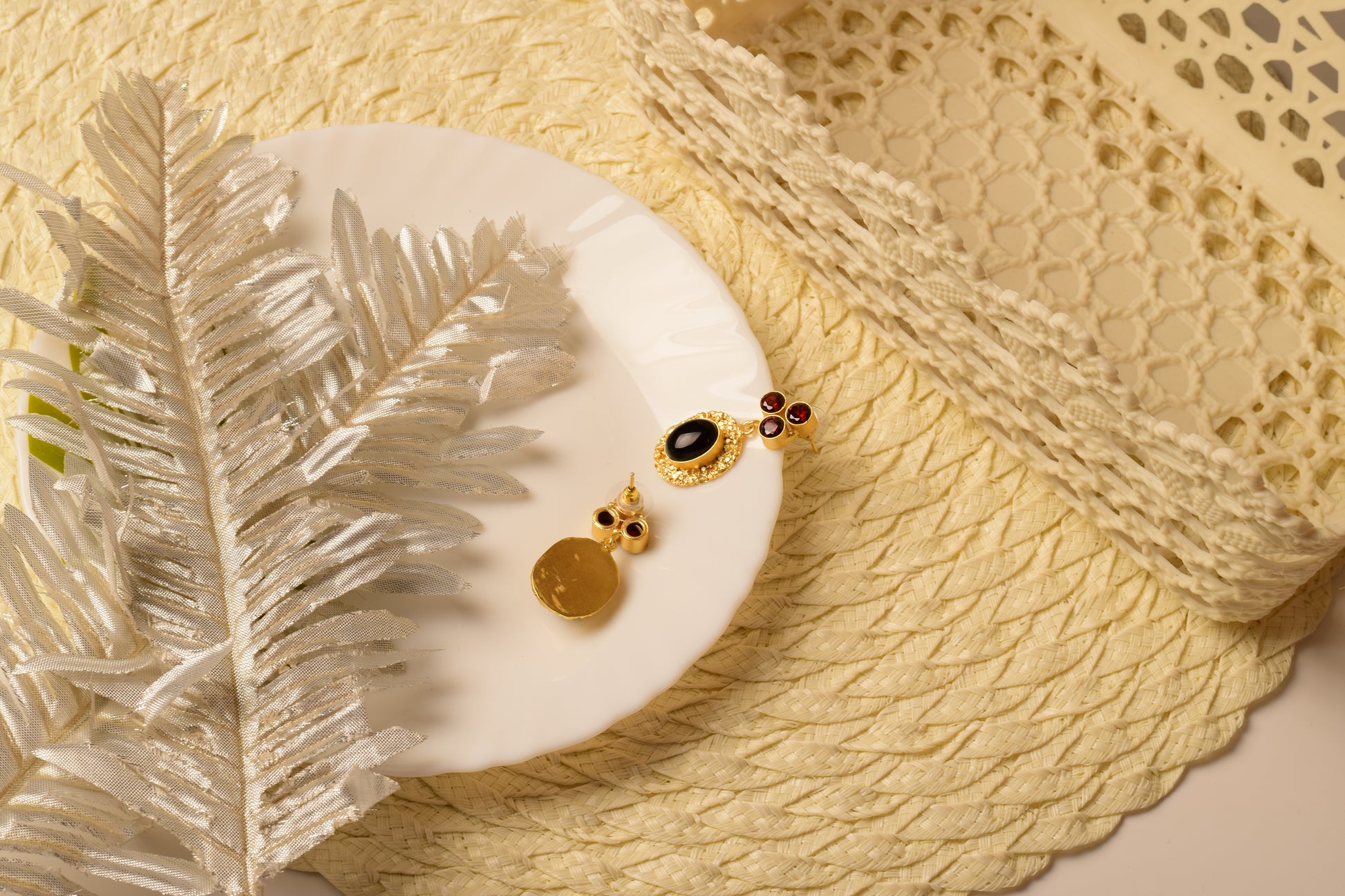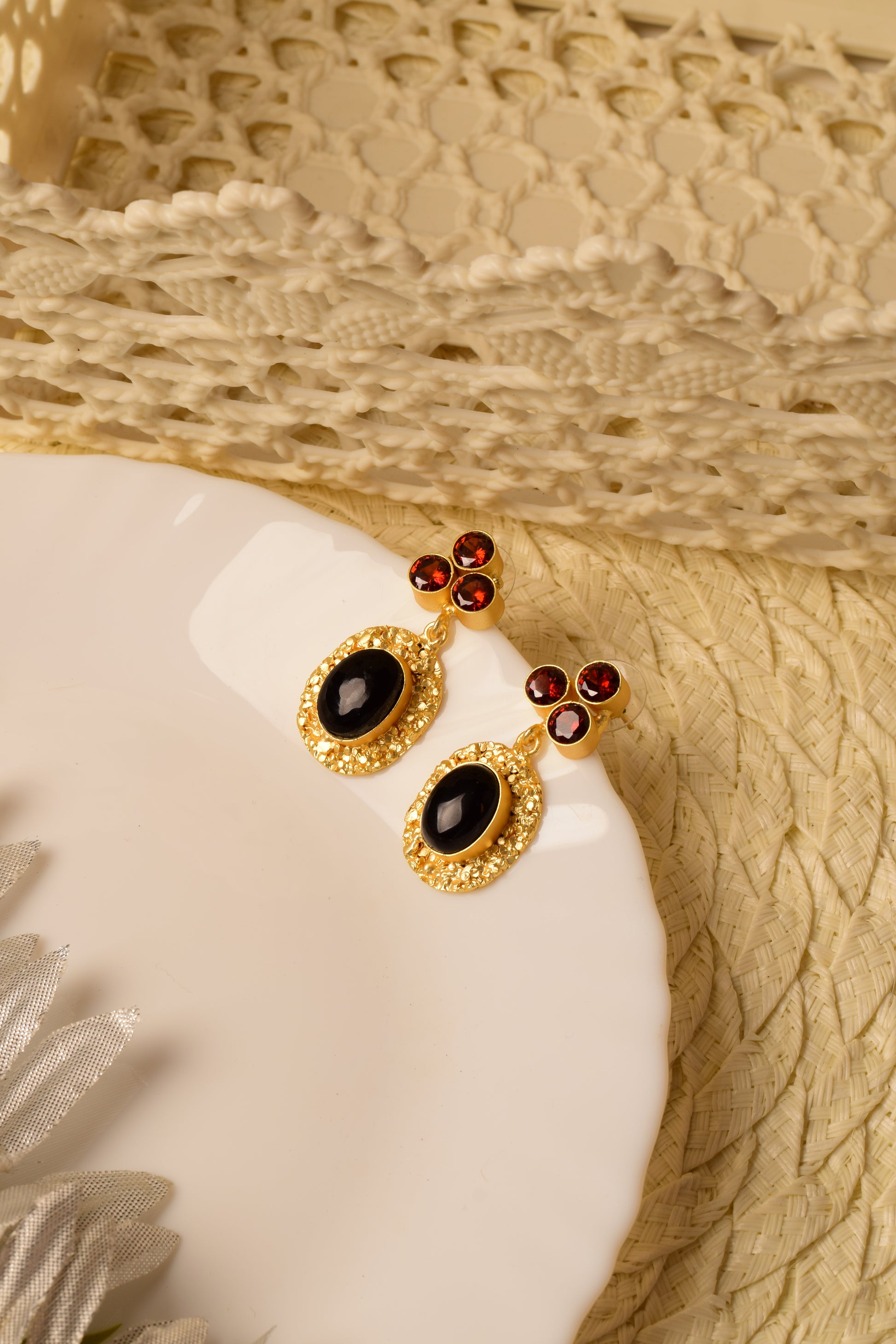 Elegant, dramatic, and irresistibly chic the Midnight Ember Drop Earrings blend deep black stones with fiery red crystal studs to create the perfect balance of sophistication and bold charm. Set in textured gold plating, the oval drops add a touch of vintage glamour, while the triple red-crystal top brings a modern, striking twist.