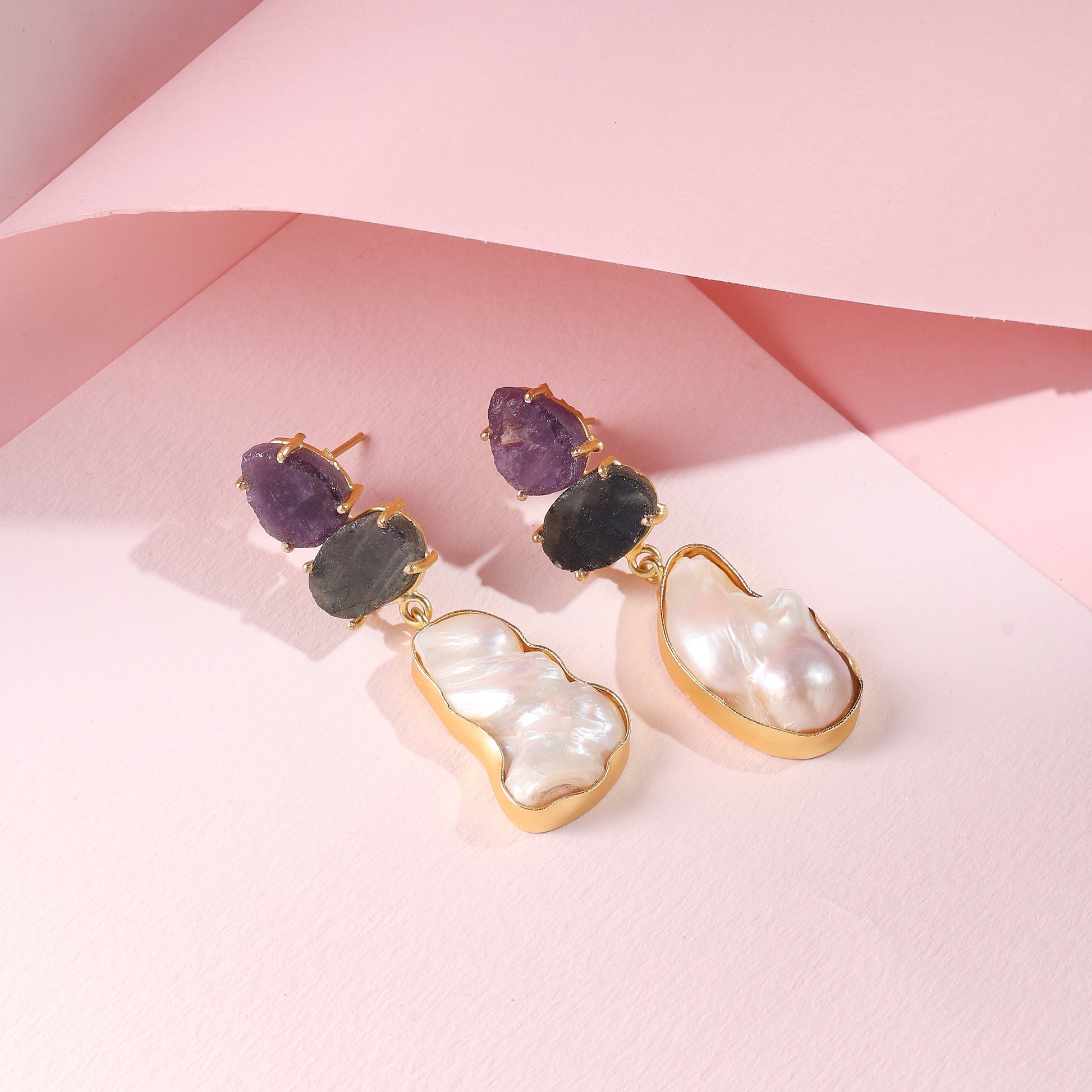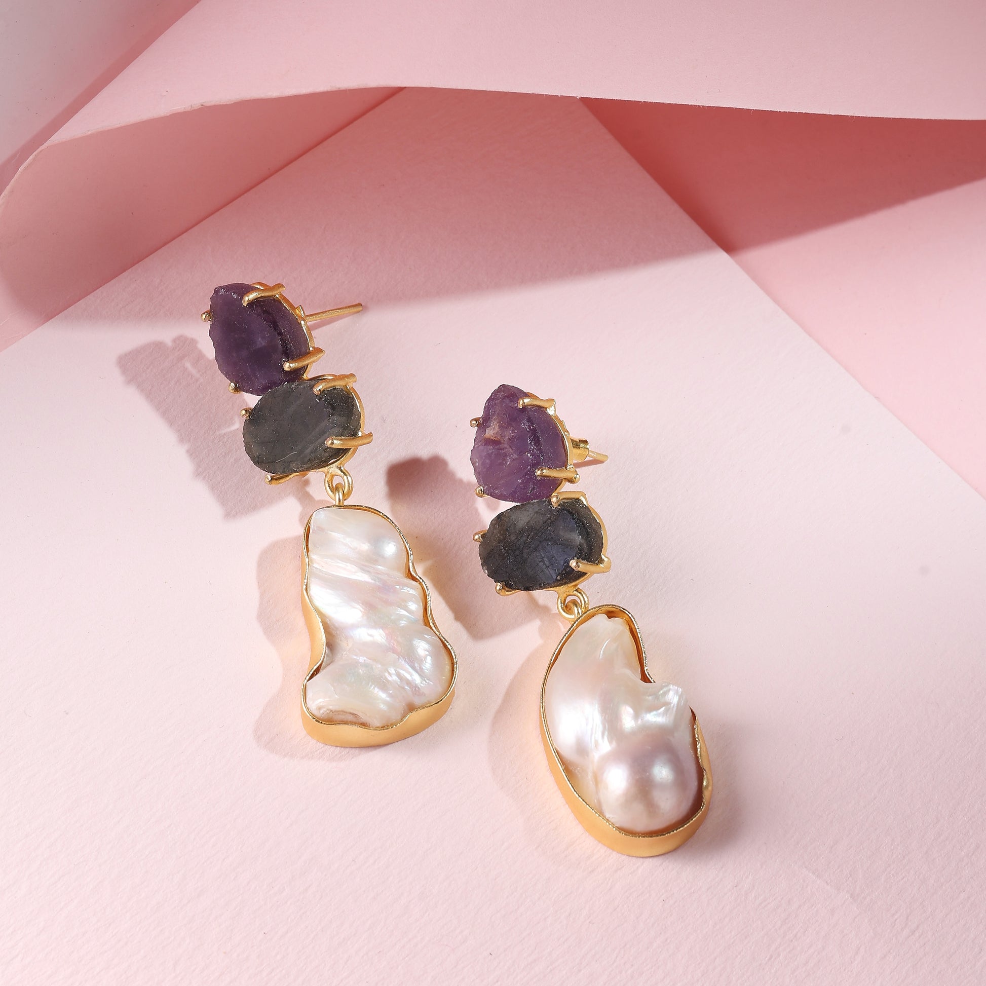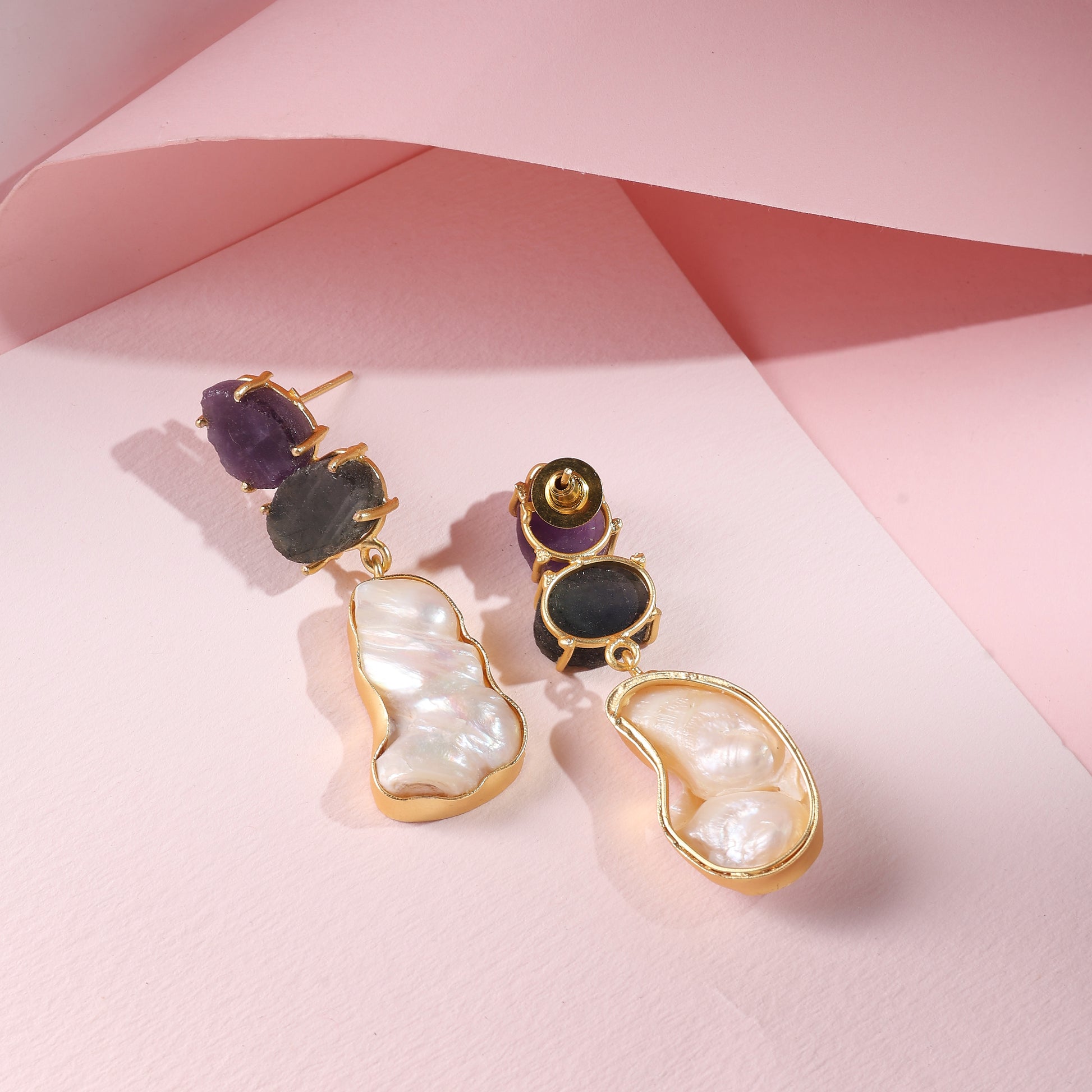 A bold yet ethereal blend of nature’s treasures, the Midnight Glow Earrings bring together raw amethyst, black tourmaline, and luminous baroque pearls. The deep, grounding tones of the stones beautifully contrast with the radiant sheen of the pearls, creating a design that’s both mystical and elegant. Hand-set in a gold-plated finish, these earrings are perfect for festive nights, special occasions, or when you want to embrace your inner glow with a touch of drama.