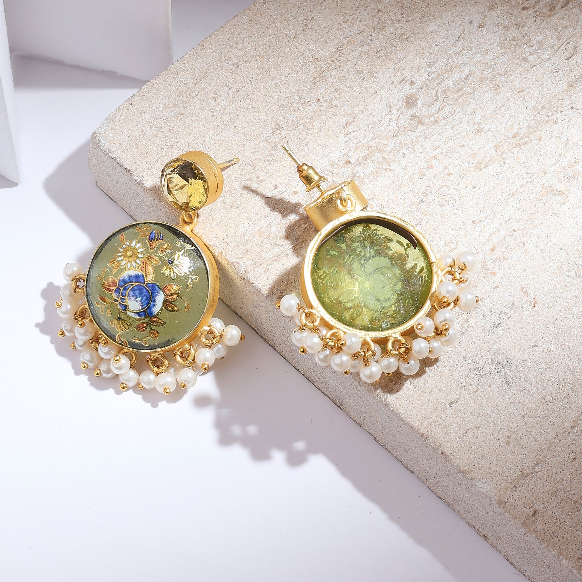 Where art meets ornament. The Ocean Bloom Drops feature hand-detailed floral motifs set against a soft enamel base, framed in warm gold tones and finished with delicate pearl clusters that move gracefully with you. Lightweight yet statement-worthy, these earrings blend vintage romance with contemporary elegance perfect for festive gatherings, wedding celebrations, and intimate evenings alike.