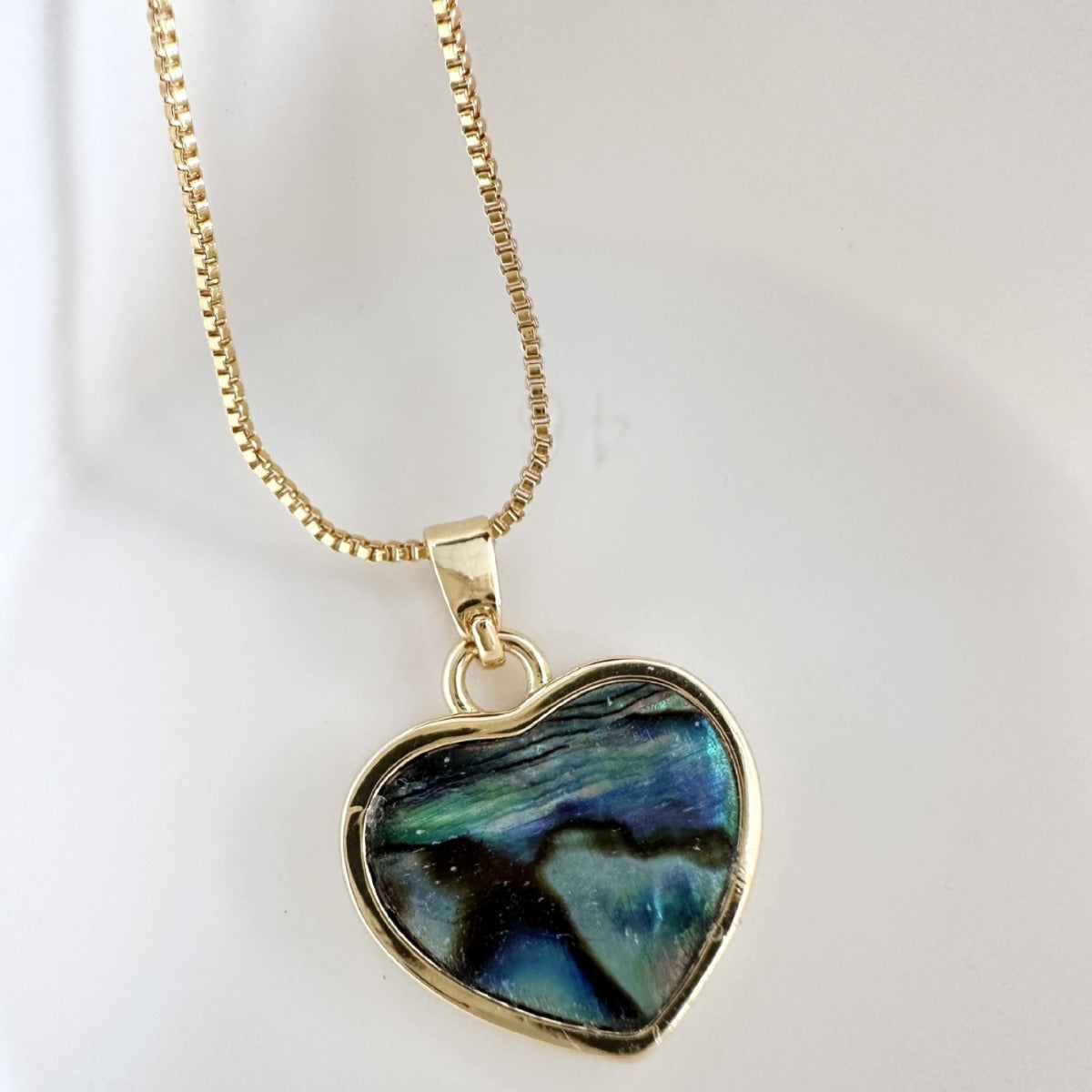 The Ocean Heart Necklace is a timeless expression of love and nature’s artistry. Crafted with an iridescent abalone shell at its core, each pendant captures shifting shades of blue, green, and violet resembling the ever-changing waves of the sea. One side features an elegant gold filigree overlay with a delicate rose motif and a sparkling accent stone, symbolizing love blossoming from the heart. The reverse side showcases the raw, natural beauty of the abalone shell, making the pendant beautifully versatile and wearable both ways.