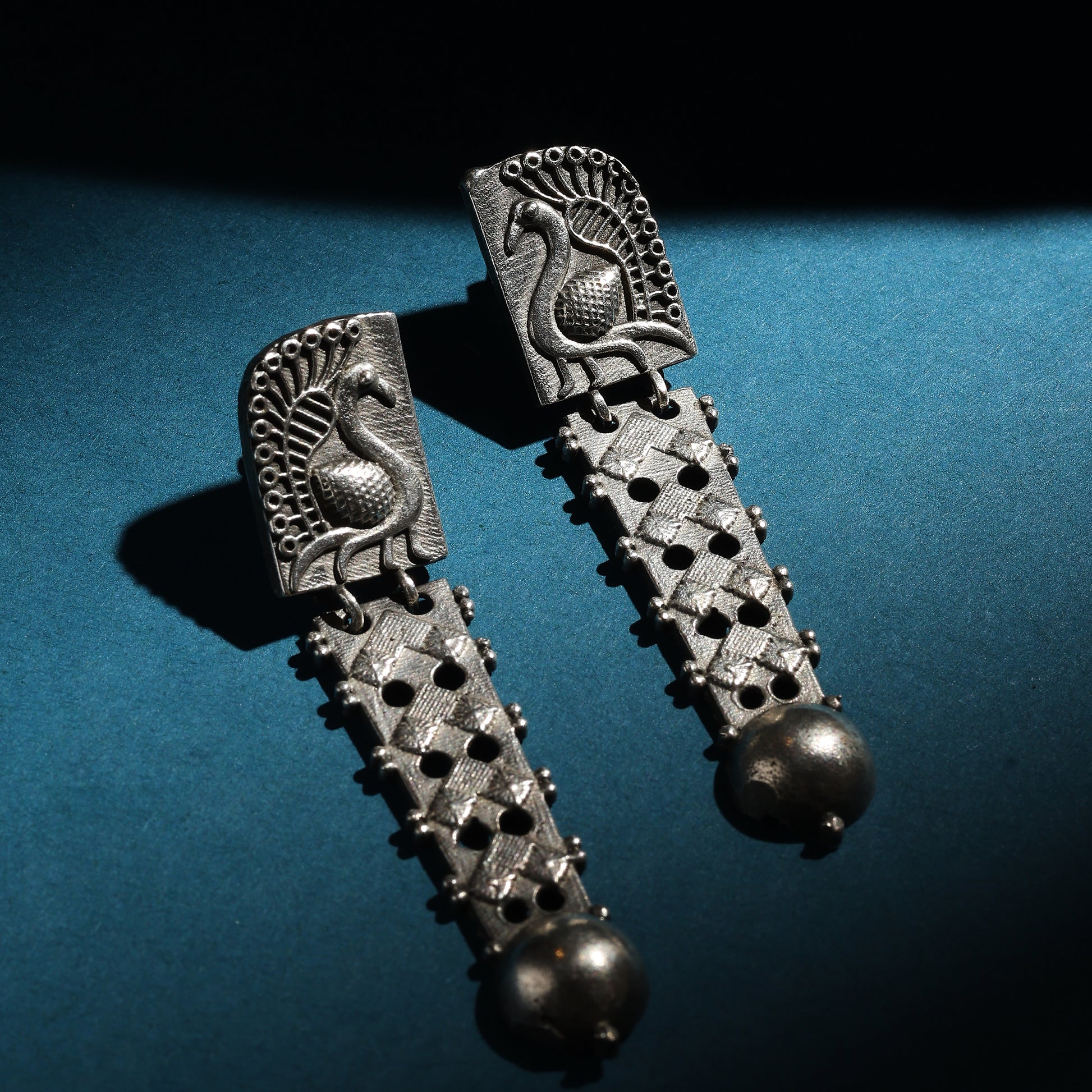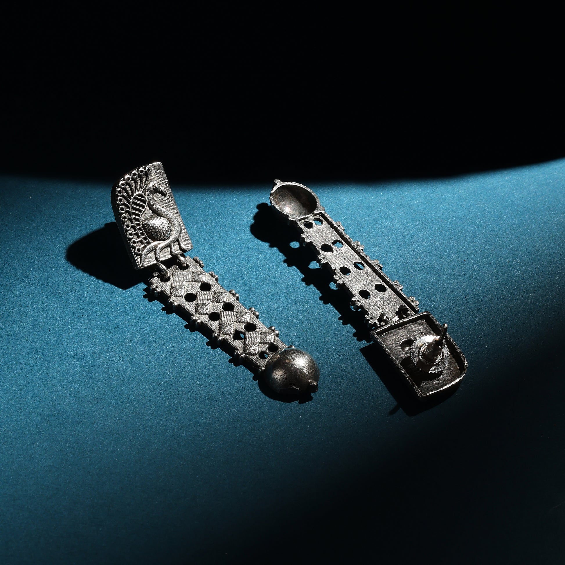 Celebrate the season of dance and devotion with the Peacock Grace Earrings. Handcrafted in an oxidized silver finish, these earrings feature a beautifully detailed peacock motif paired with intricate latticework and a bold spherical drop.