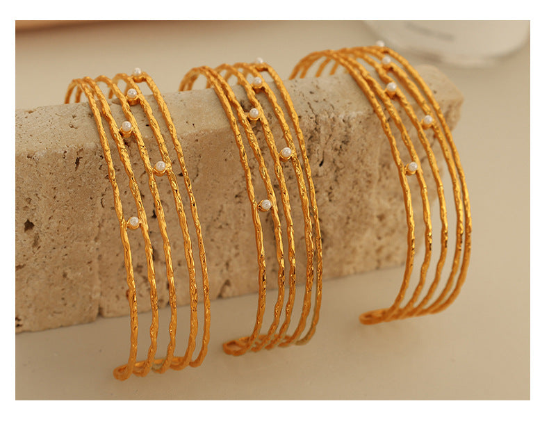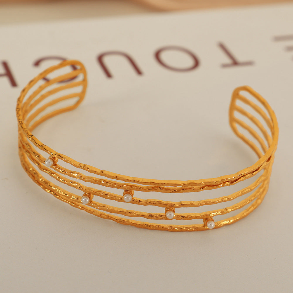 Graceful and versatile, this open kada features textured golden bands delicately accented with dainty pearls. Its airy design balances elegance with everyday wearability, making it a perfect statement piece for both festive occasions and modern minimal styling.