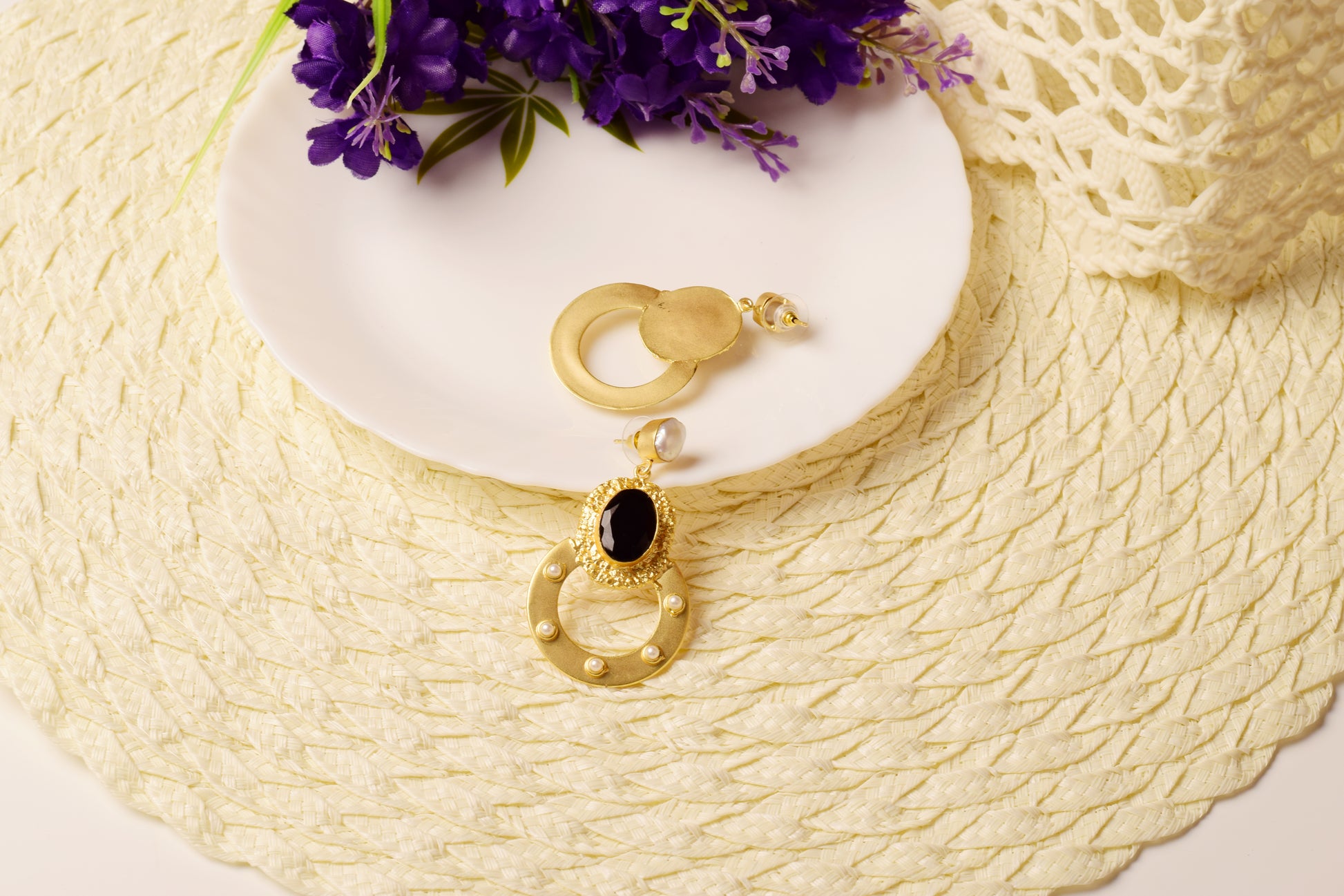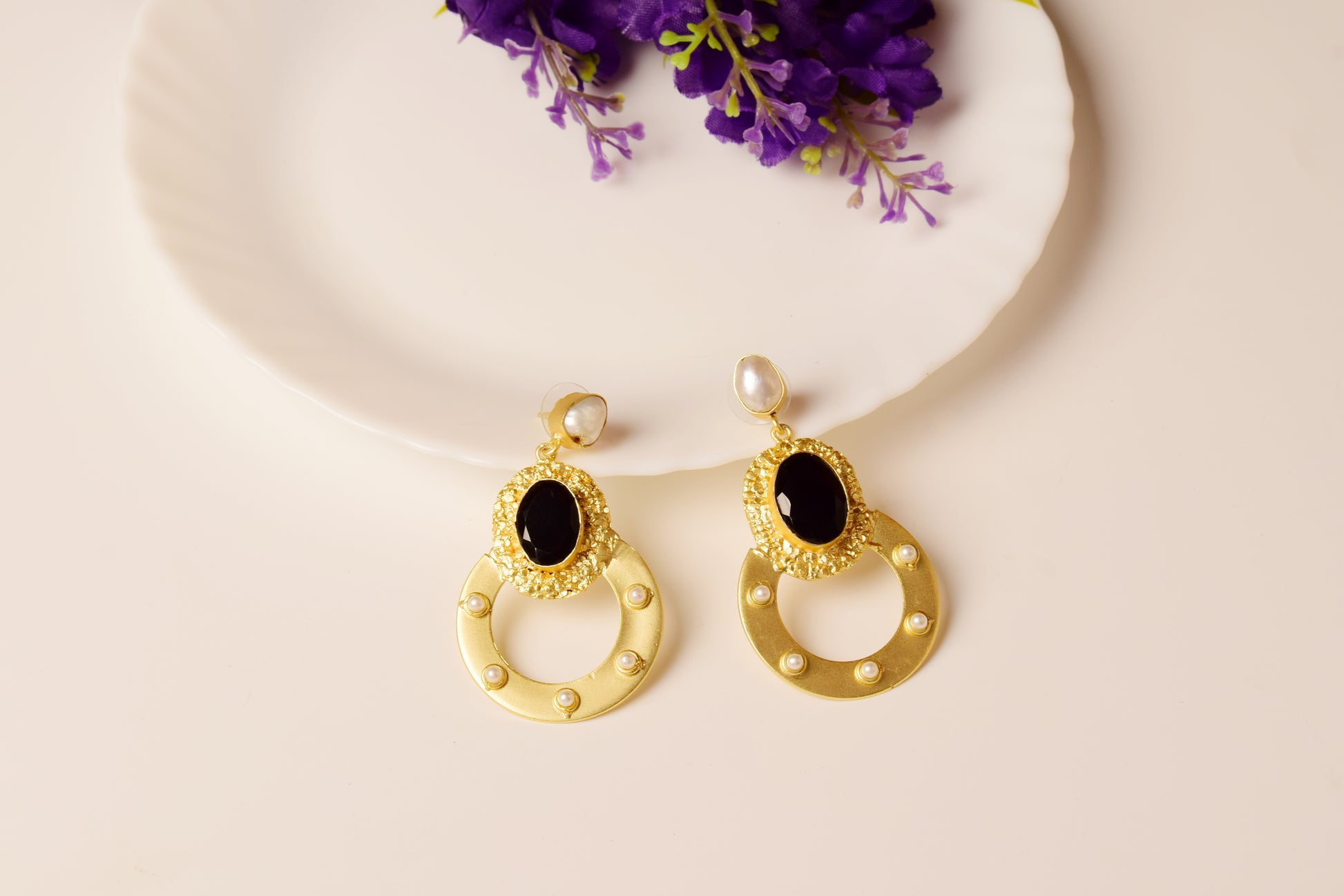 Elevate your style with our Regal Noir Pearl Hoop Earrings, handcrafted in brass and finished with a luxurious gold tone. The design features a striking black oval stone set in a textured gold bezel, paired with a bold circular hoop accented with delicate mini pearls. The top is adorned with a lustrous pearl stud, bringing balance and elegance to the entire piece.