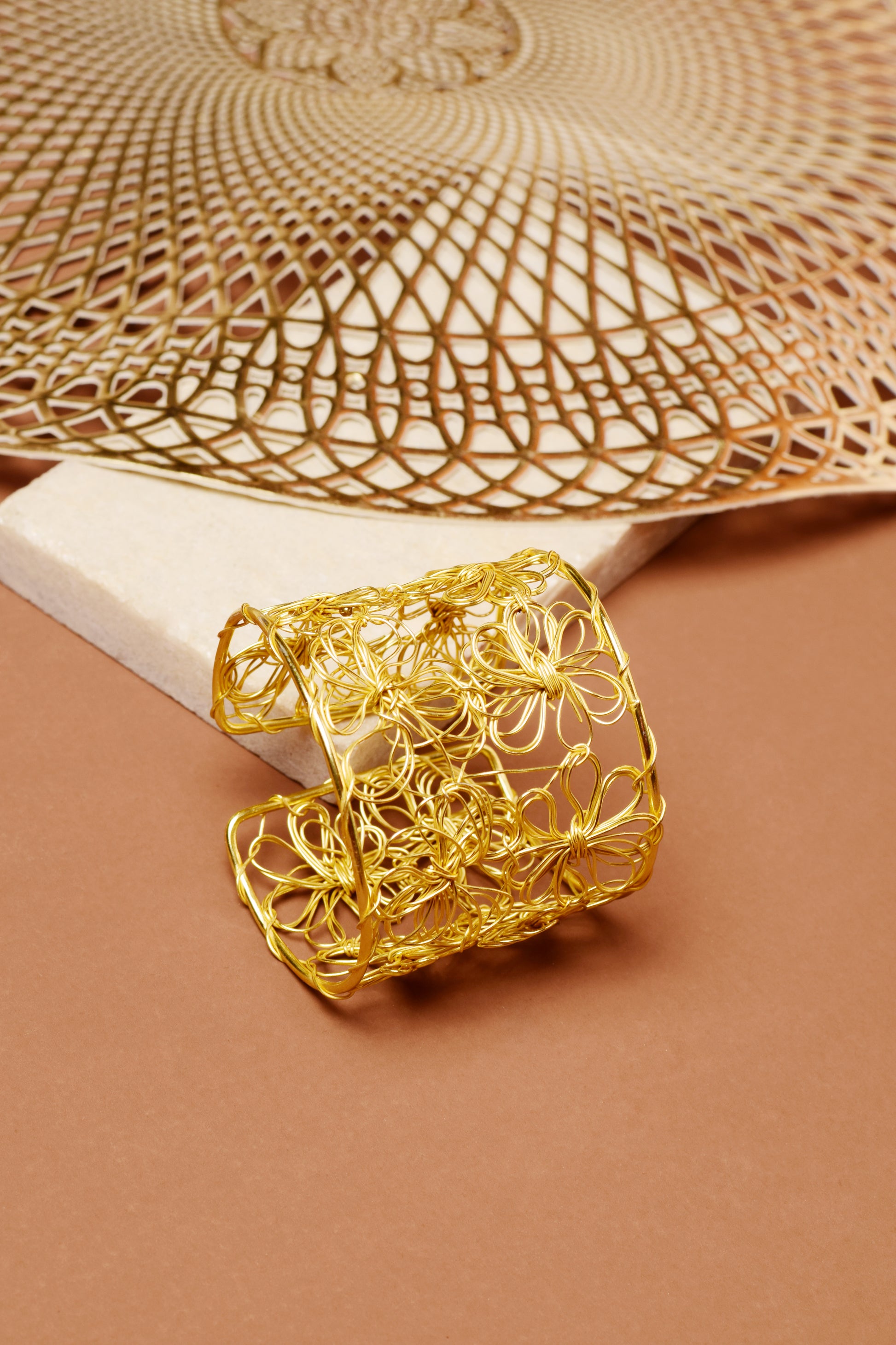Introducing The Bloom Lattice Cuff, a delicate yet striking statement piece handcrafted from high-quality brass and finished in a radiant matte-gold polish. The intricate open-work floral lattice is shaped entirely by hand, giving each piece its own unique character and an unmistakable artisanal charm.